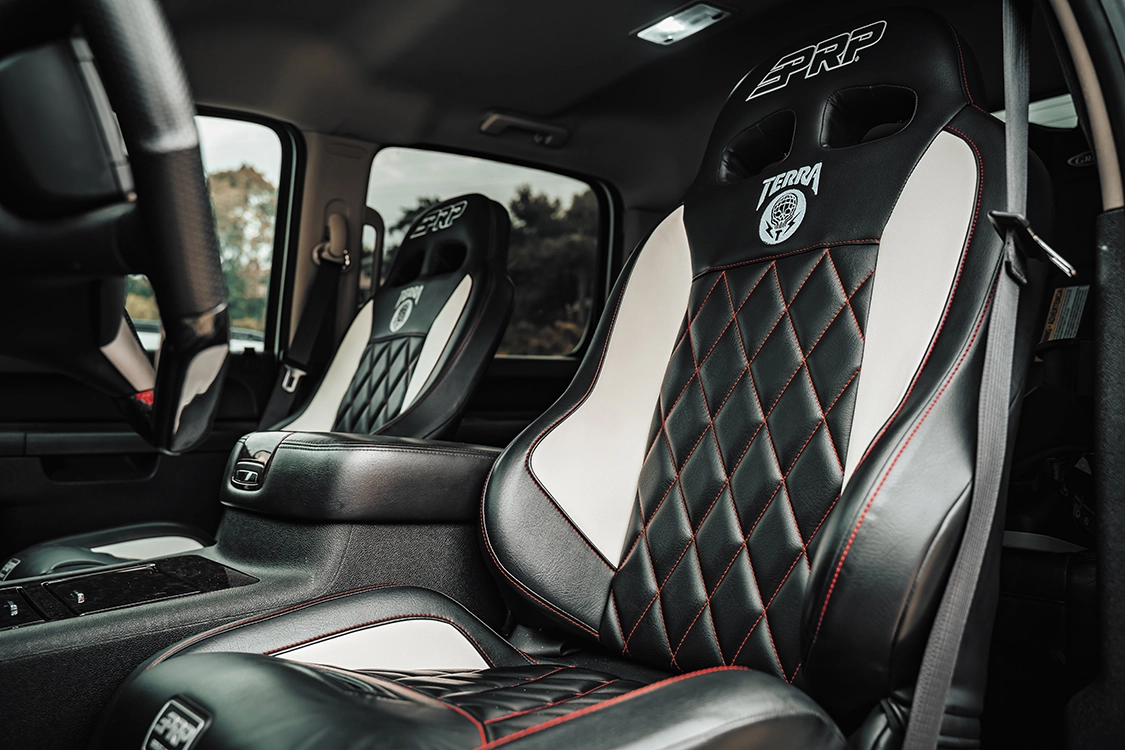 Interior & Accessories:Seats: PRP bucket recliners, Upholstery: Black and white vinyl with red stitching, Audio: Alpine system, JL W3 12-inch subwoofers, Communication: Rugged Radios M1 race radio