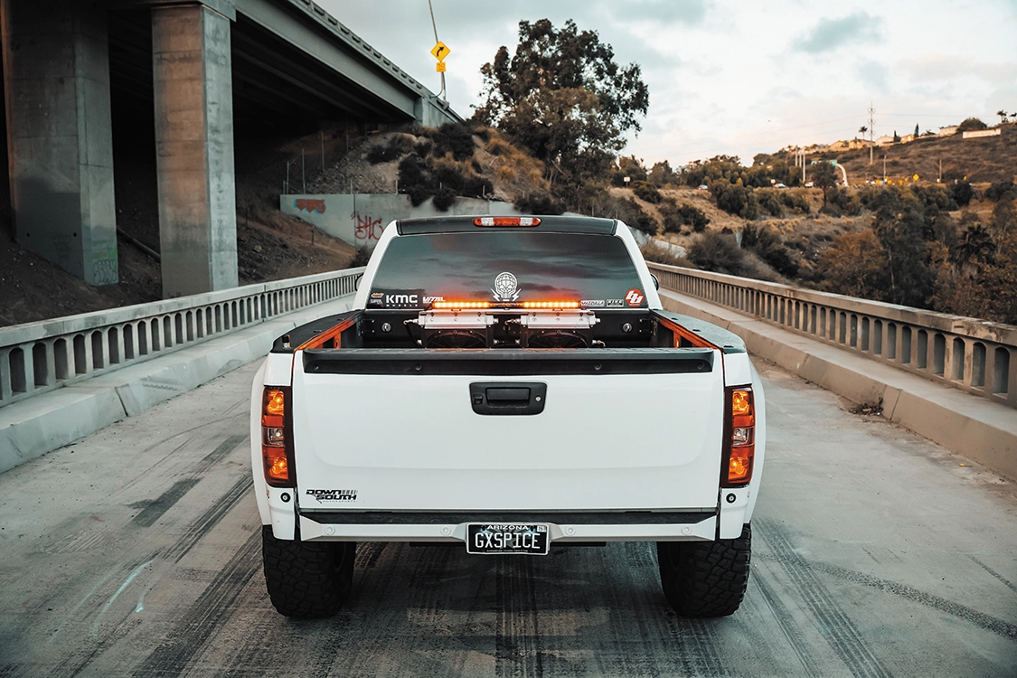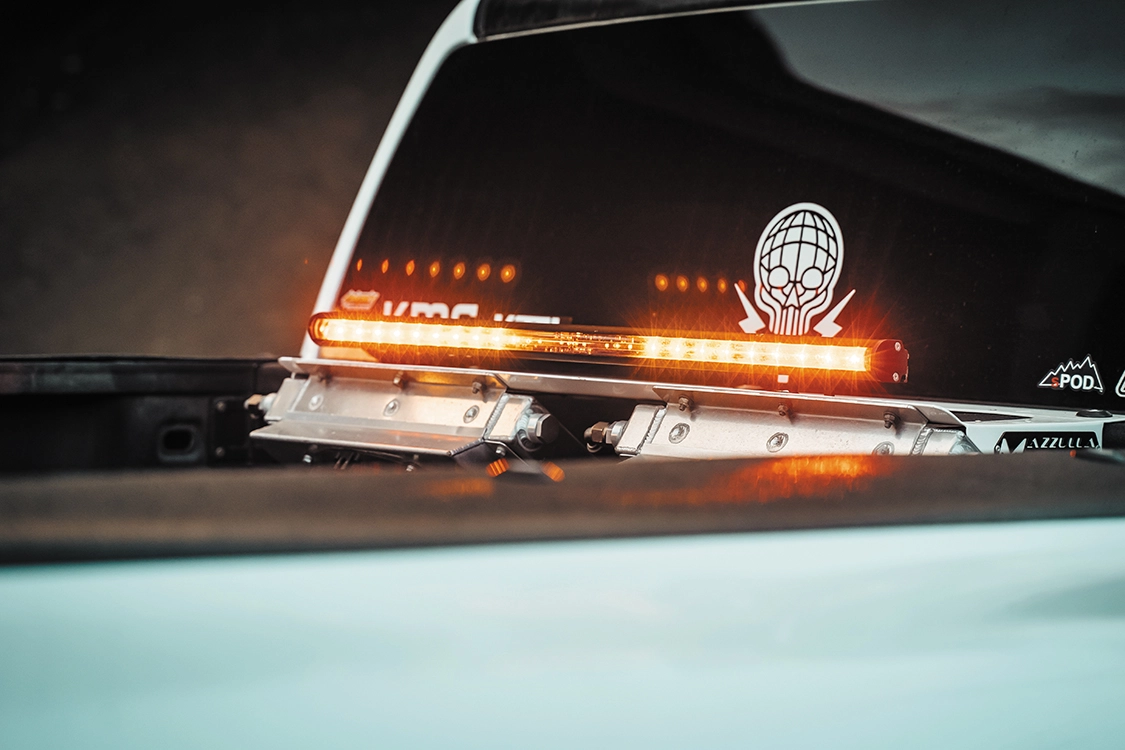Visually, the Silverado strikes a perfect balance between style and purpose. Wrapped in Chevy Summit White with a gloss black vinyl roof, it’s clean and understated while exuding confidence. Trailer Products fiberglass fenders, Line-X San Diego bed liner, and custom shock towers highlight the truck’s off-road pedigree. Baja Designs LP4, S1, and S8 lights ensure visibility in low-light conditions, while rock lights under the bed and in the fender wells add functional style.