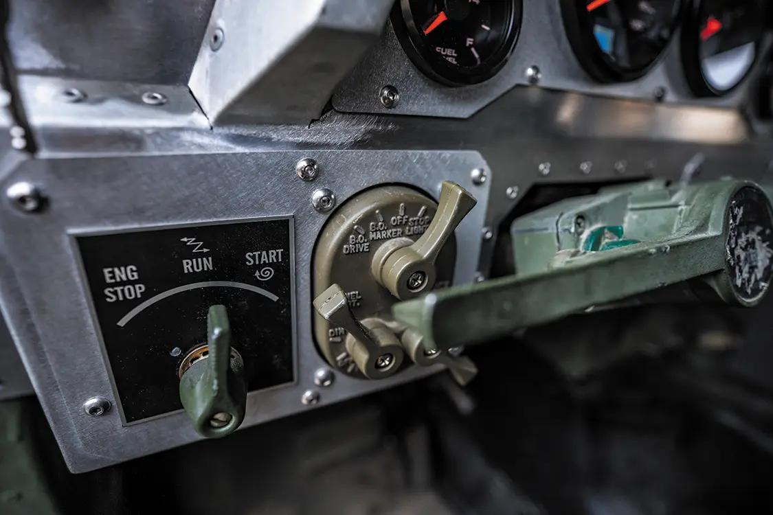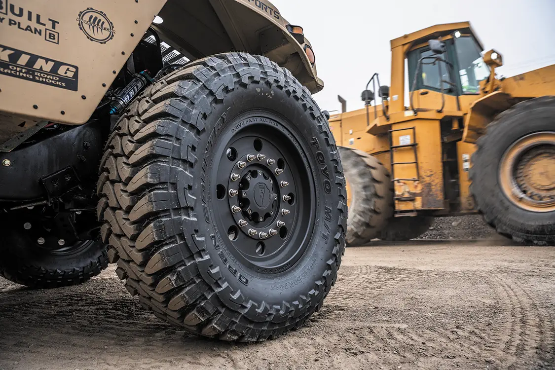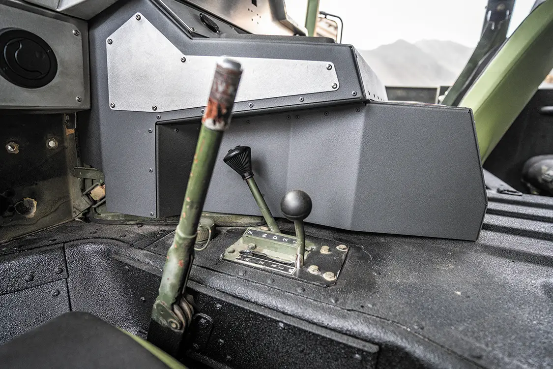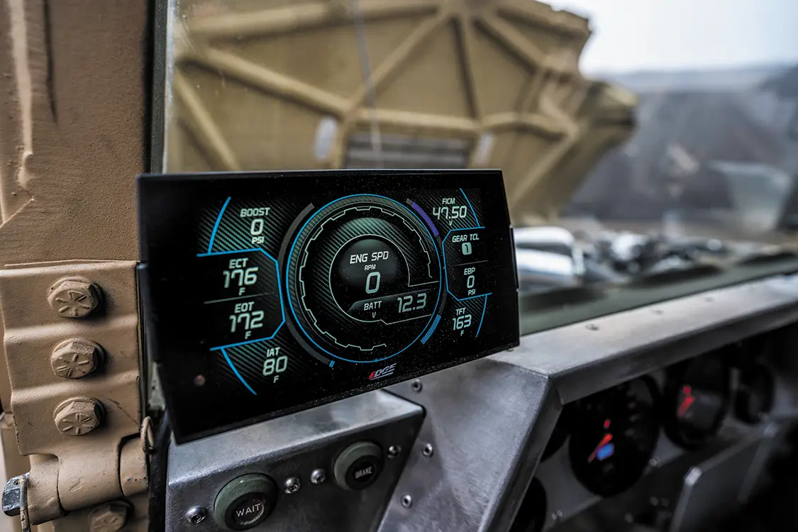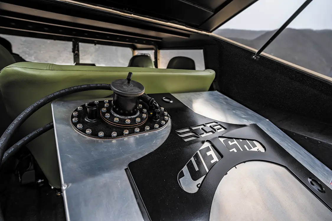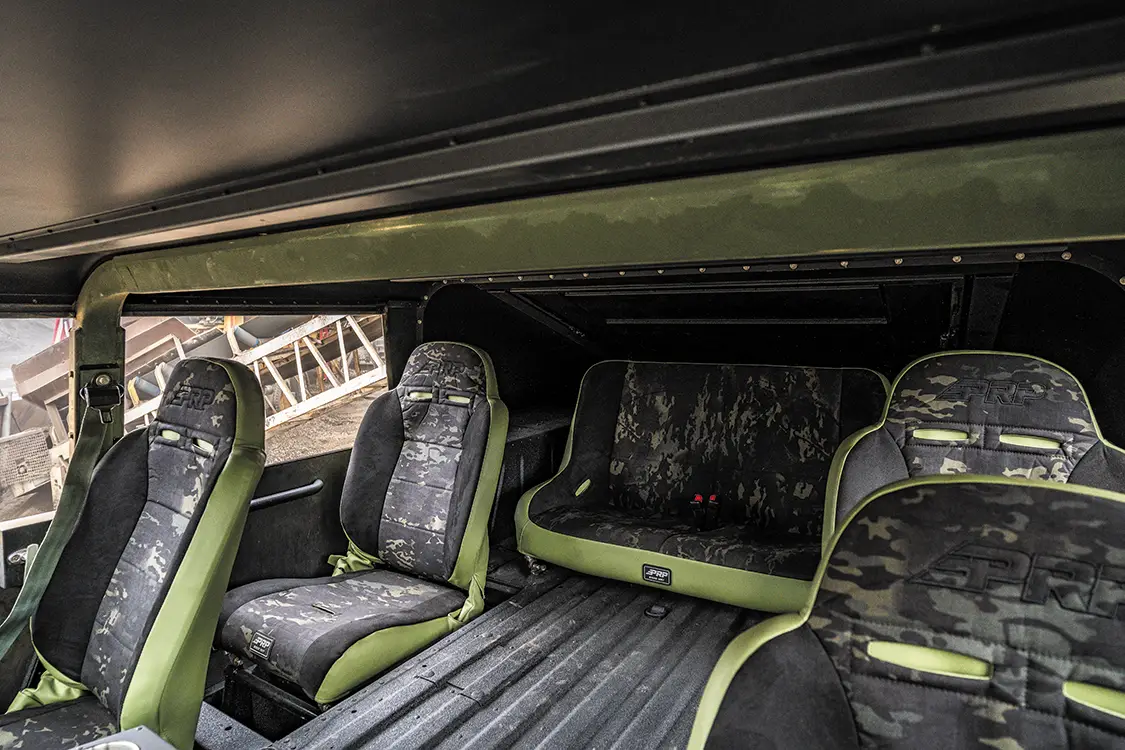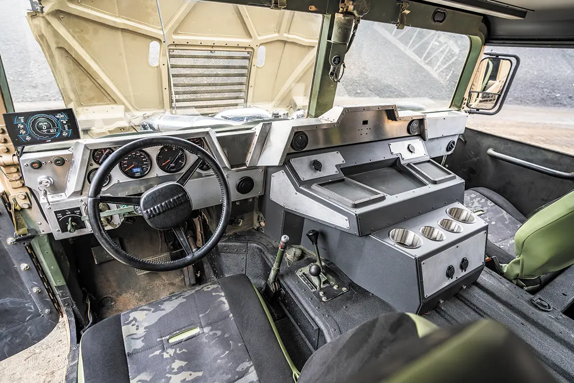 The chassis isn’t just cleaned up either, it has been fully redesigned. A fresh 5.5-inch lift, King shocks, and heavy-duty brackets let the Humvee run 40×15.5R20 Toyo Open Country M/Ts on custom Predator 20x10s. The whole frame has been stripped, blasted, and repainted. Even the interior received some love by adding PRP racing buckets wrapped in green vinyl and black camo cloth, plus a custom-built Plan B Trucks dash and Speedhut gauges.