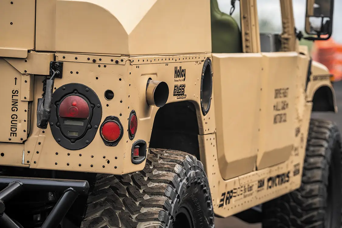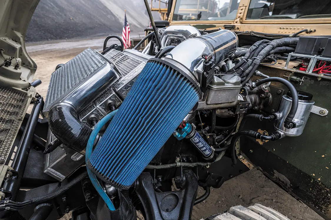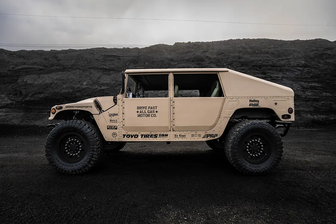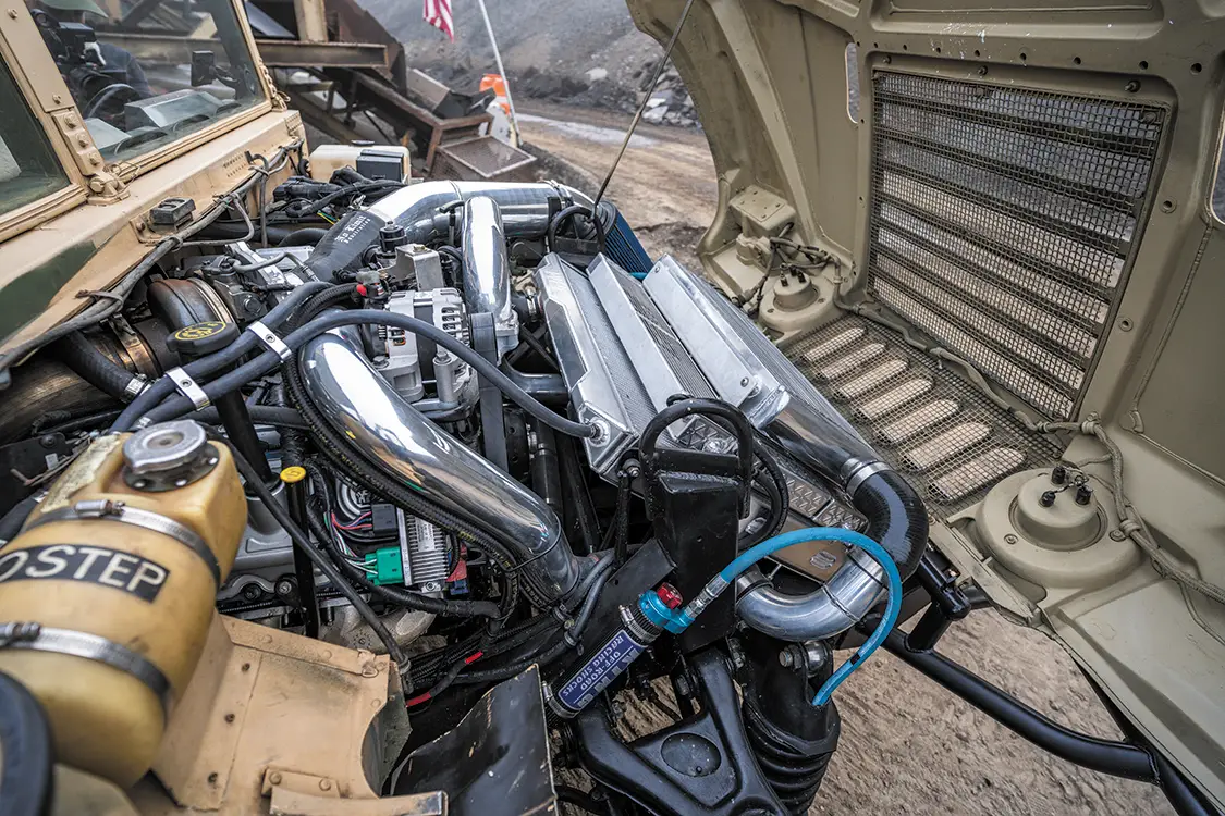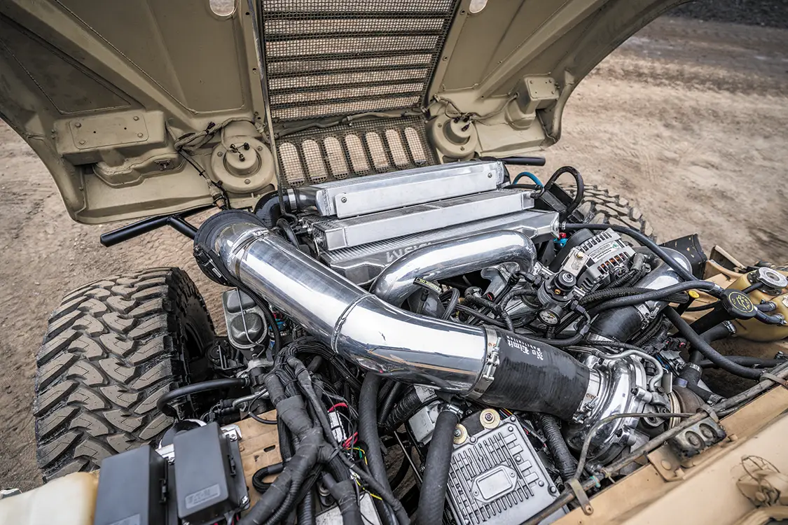Starting with a genuine U.S. Army-issued Desert Tan H1, the team ditched the factory power plant and dropped in a fully built 6.0L V-8 diesel out of a 2005 Ford. This isn’t your average swap, it took custom mounts, reworked plumbing, a whole new wiring layout, and some serious patience. Under the hood, it’s loaded with Power Stroke Products O-ringed heads, ceramic-coated Mahle pistons, lifters, 175cc/30% injectors, and a cam that rumbles low and hits hard. Boost comes from a modified 9-blade turbo, which feeds a custom intercooler setup.
