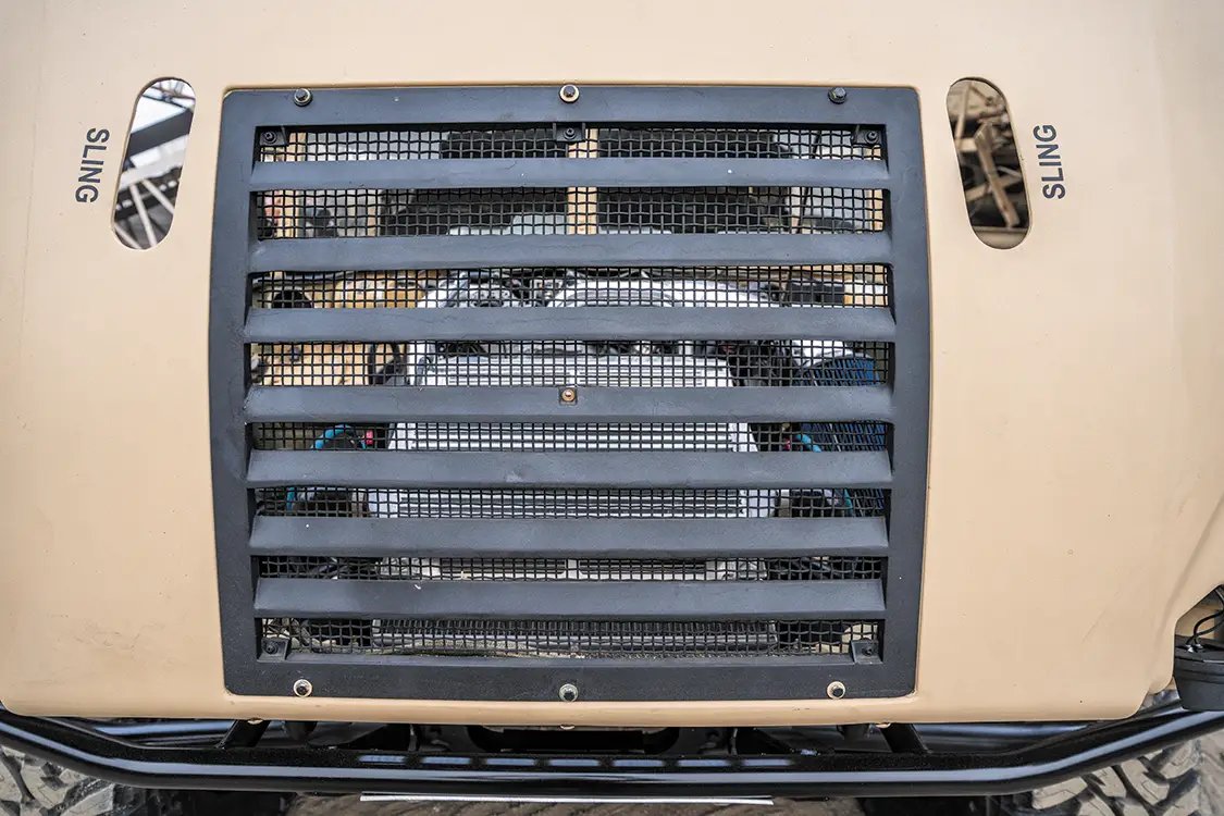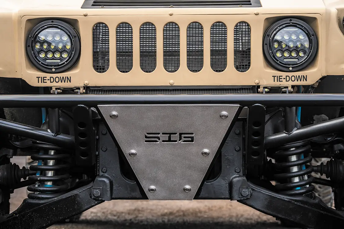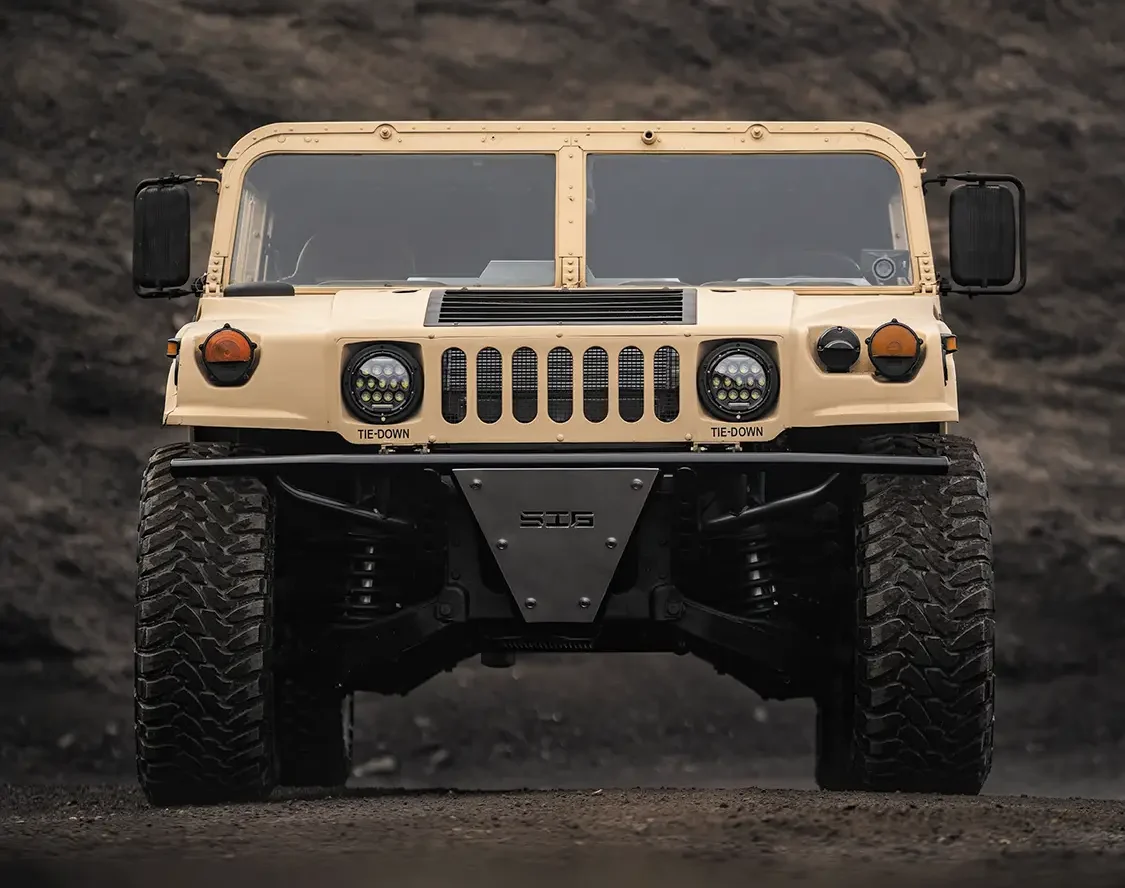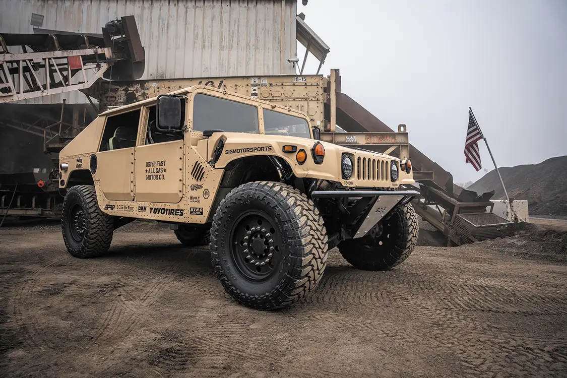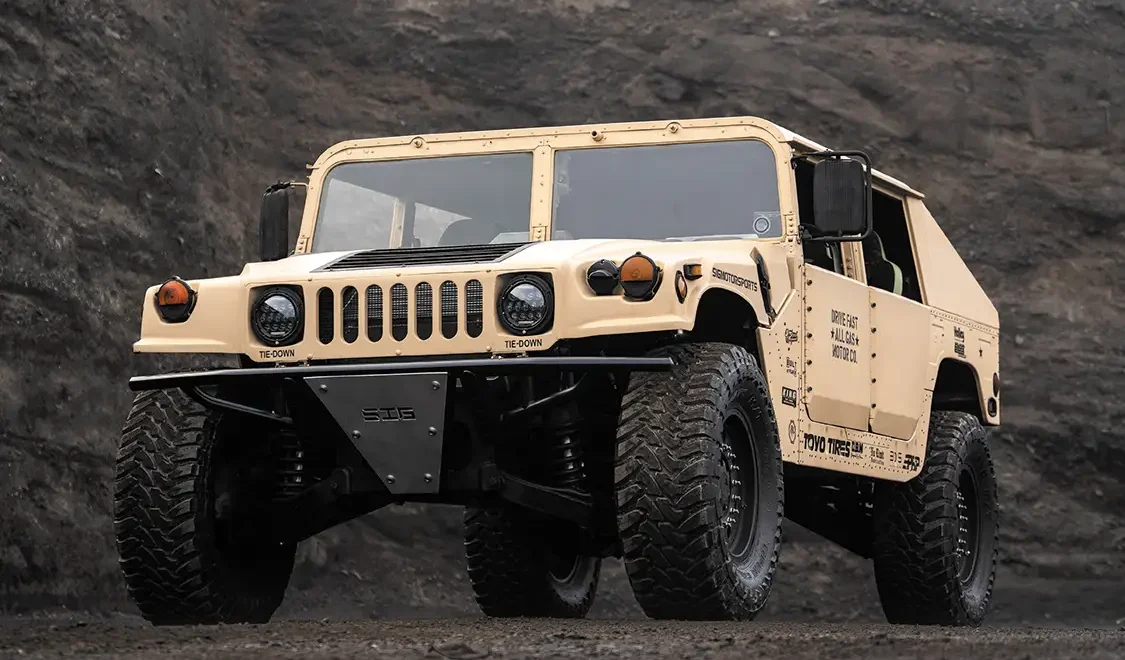 Starting with a genuine U.S. Army-issued Desert Tan H1, the team ditched the factory power plant and dropped in a fully built 6.0L V-8 diesel out of a 2005 Ford. This isn’t your average swap, it took custom mounts, reworked plumbing, a whole new wiring layout, and some serious patience. Under the hood, it’s loaded with Power Stroke Products O-ringed heads, ceramic-coated Mahle pistons, lifters, 175cc/30% injectors, and a cam that rumbles low and hits hard. Boost comes from a modified 9-blade turbo, which feeds a custom intercooler setup.