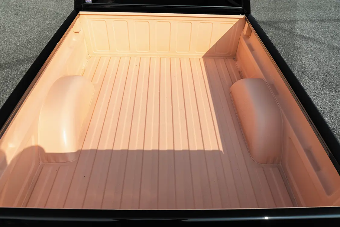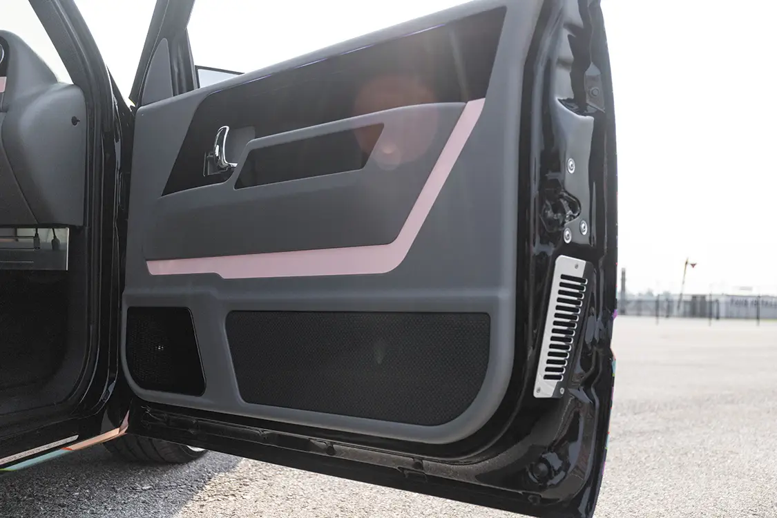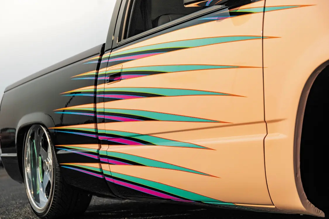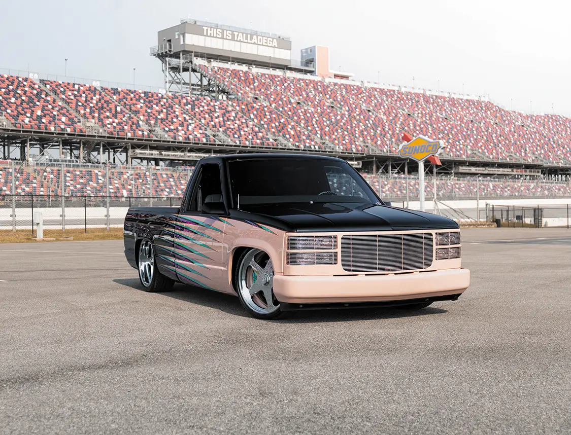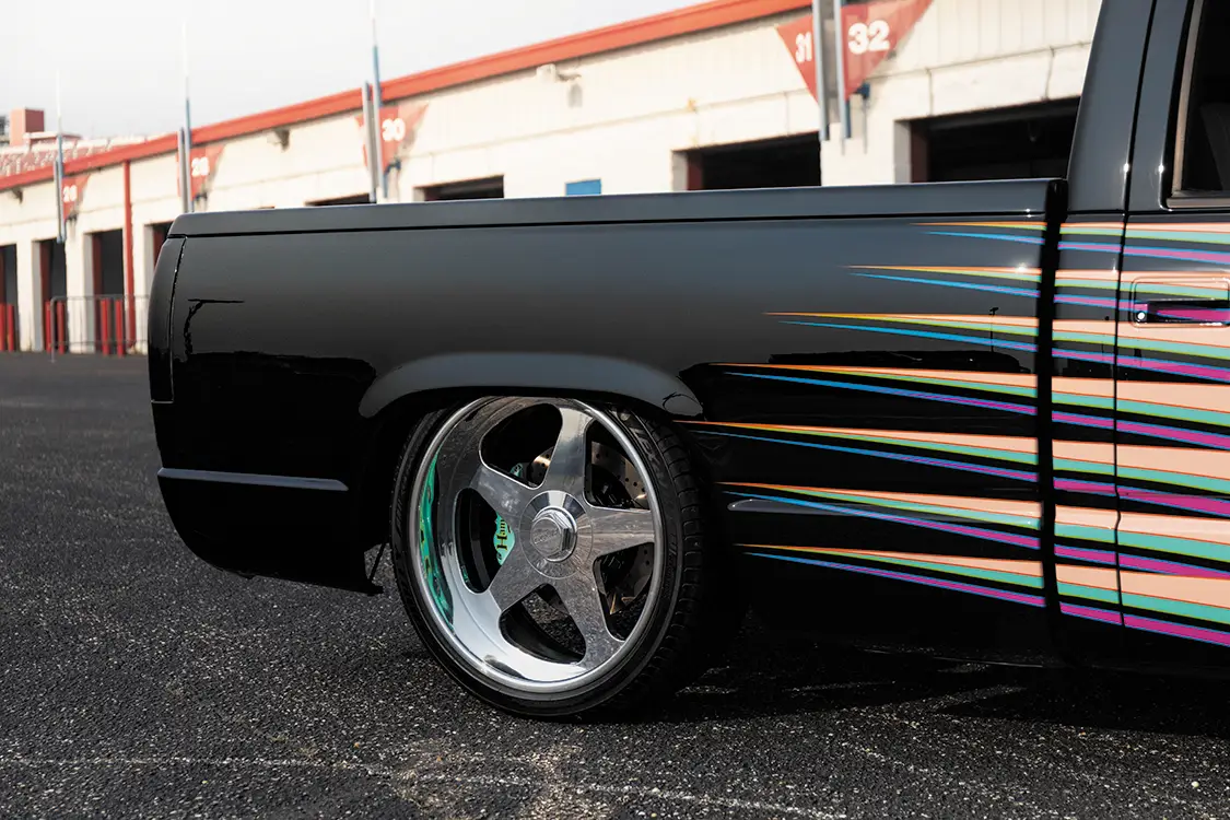 No ‘90s truck would be complete without an iconic phantom grille, and Michael Johnson absolutely nailed the execution. For a cleaner, sleeker silhouette, the team deleted the third brake light and stake holes from the bed, resulting in a streamlined finish that modernized the classic lines.
