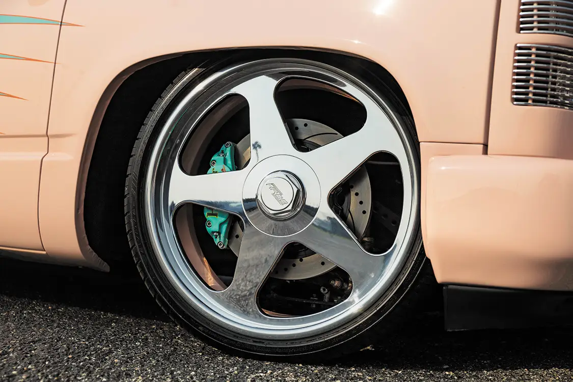 But this build isn’t just about looks; it’s about stance. Stephen turned to Ladd Luquette of Trashy Side Fabrication in Prairieville, Louisiana, to get the drop just right. The truck sits on Hot Rods by Boyd Turbo Tech wheels, 22×8.5 in the front and 22×10 at the rear— perfectly tucked thanks to Stone Fab control arms, Aldan American coilovers, and a custom flip kit with an underbed notch. The diff was narrowed to dial in that aggressive yet elegant stance.