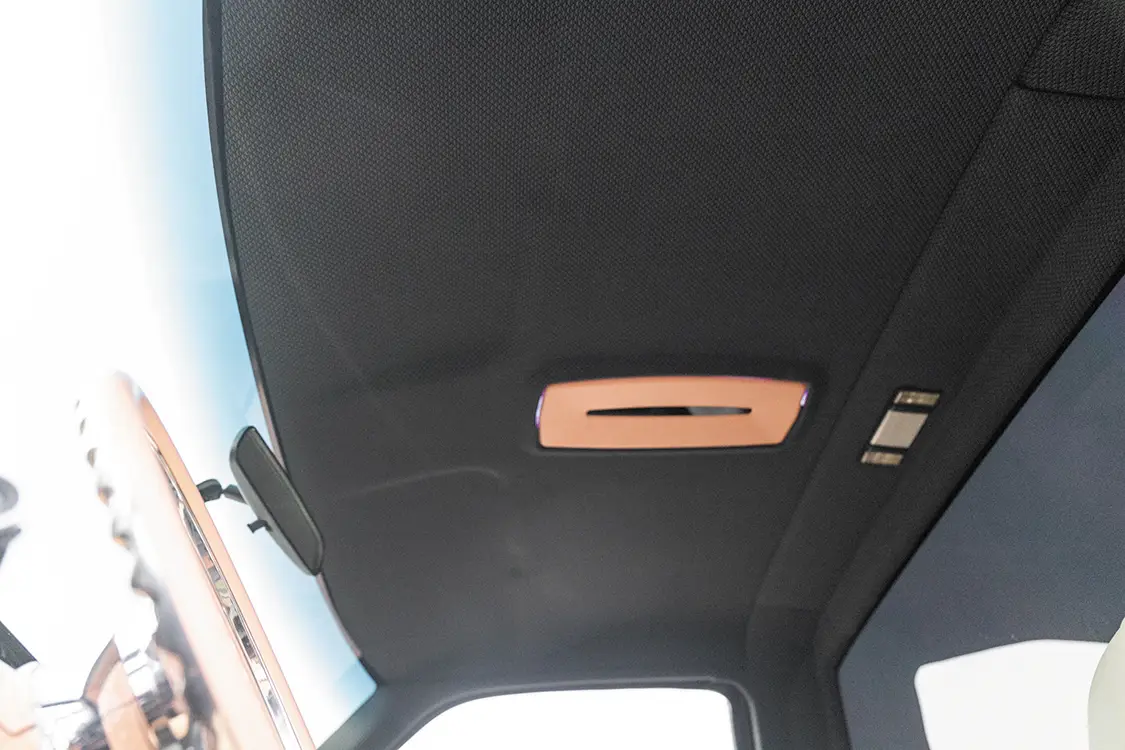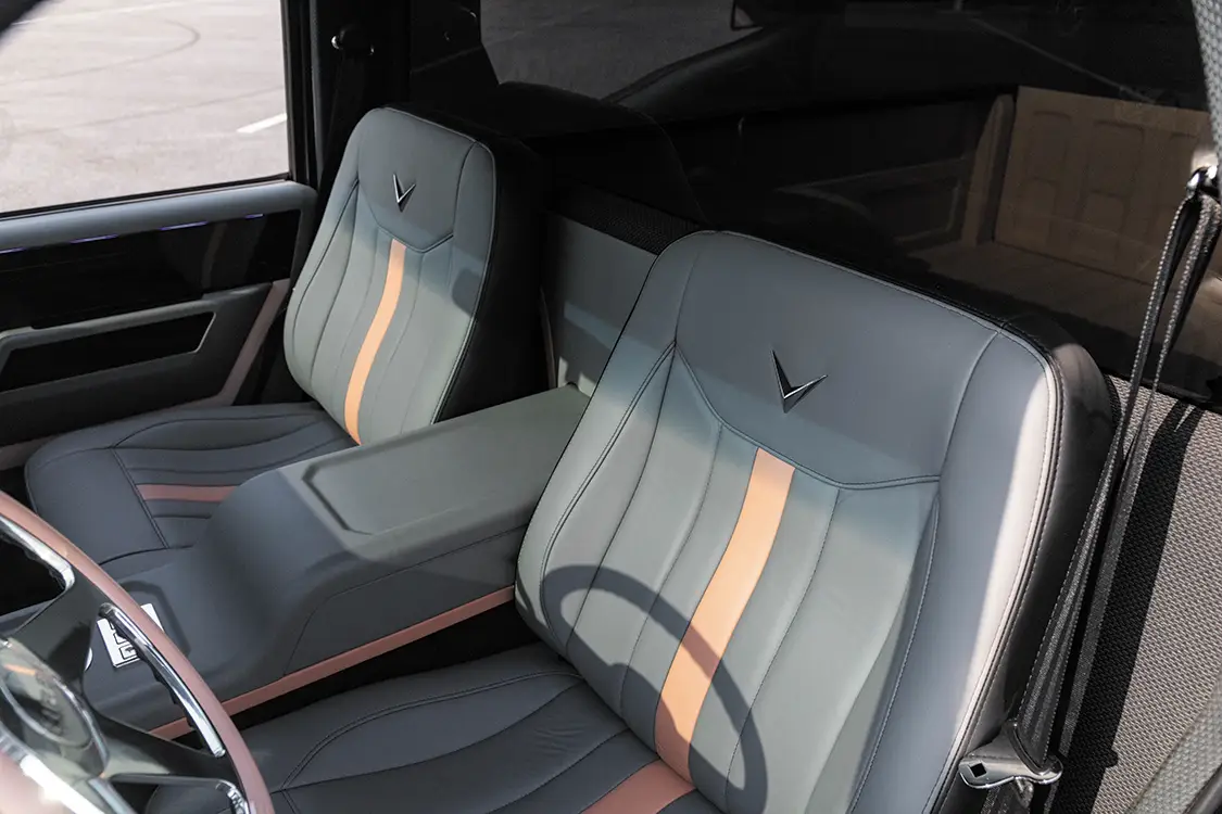 Inside, Hammer Time boasts a one-of-a-kind interior designed by Chris Pate at MTI Interiors in College Station, Texas. The cabin features Snowden bucket seats, custom door panels, and a trick center console housing a custom subwoofer enclosure. All are wrapped in a rich combination of black, gray, and peach-colored leather and twill to echo the truck’s bold exterior.