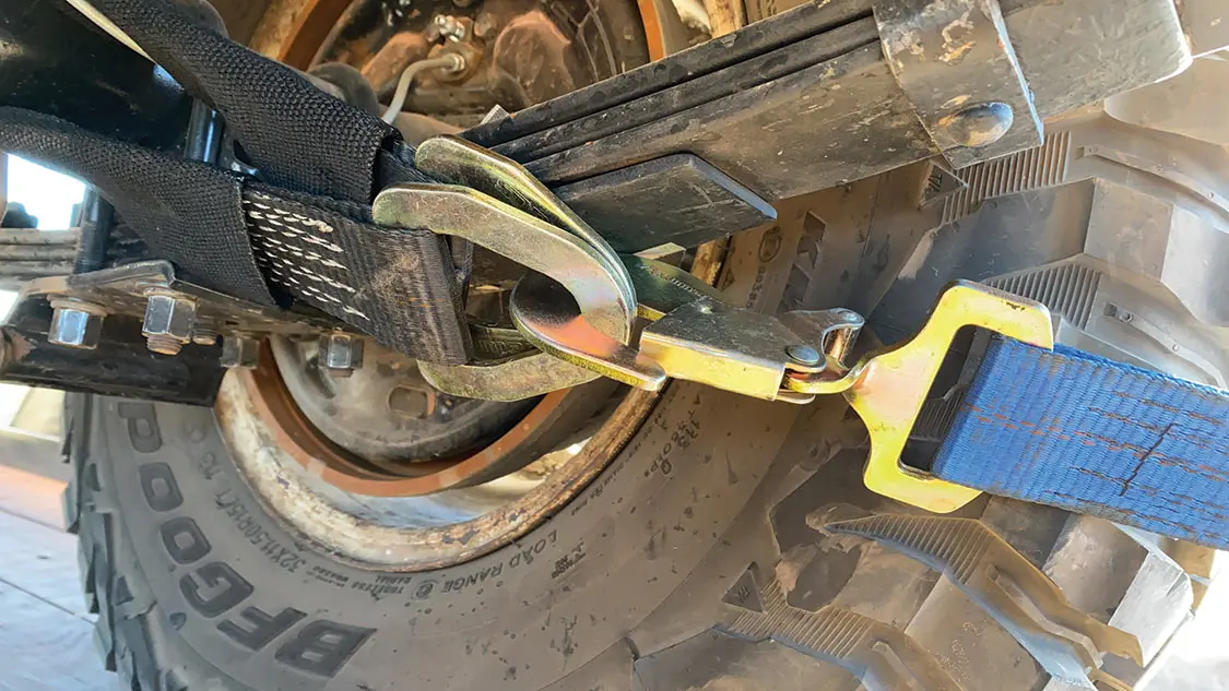 Interestingly, straps and tie downs for non-commercial use apparently fall under Wild West law…anything goes. I use gear from Mac’s Custom Tie Downs and reached out to company founder Colin McLemore for advice on this. He confirmed there isn’t a governing body regulating tie downs, and the most important thing is to utilize two separate attachment assemblies fore and aft, and buy the best system you can afford. He added, “Are you going to trust your $60,000 Jeep to $30 big box store straps?”