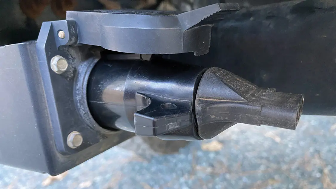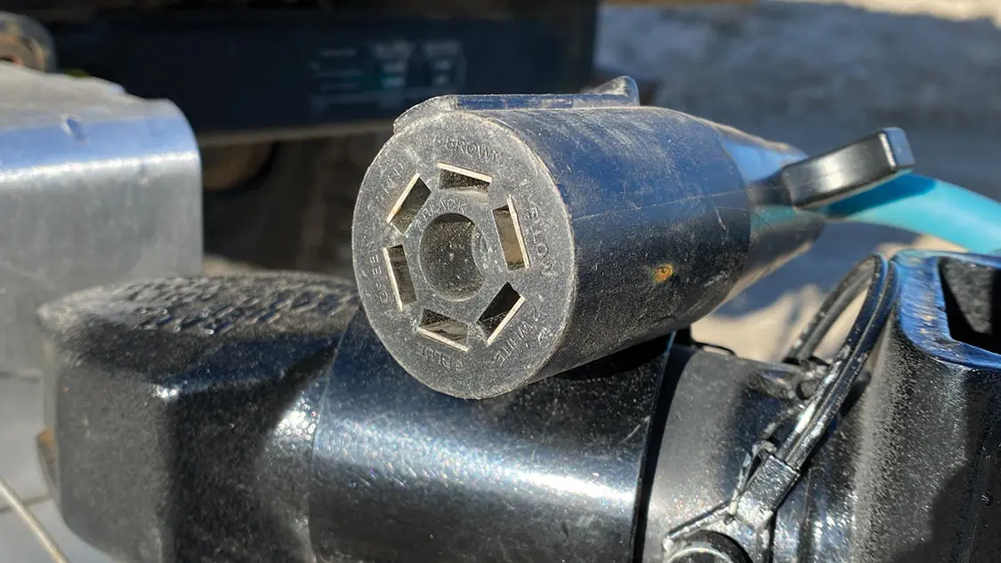 The most common wiring connectors are the flat four-pin and round seven-pin. The former manages basic lighting, while the latter has additional leads for reverse lights, electric trailer brakes, and auxiliary power (seven-pin to four-pin adapters are available to simplify choosing a seven-pin).