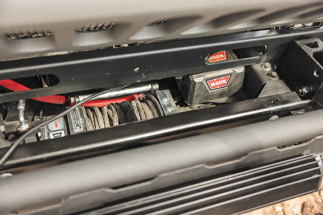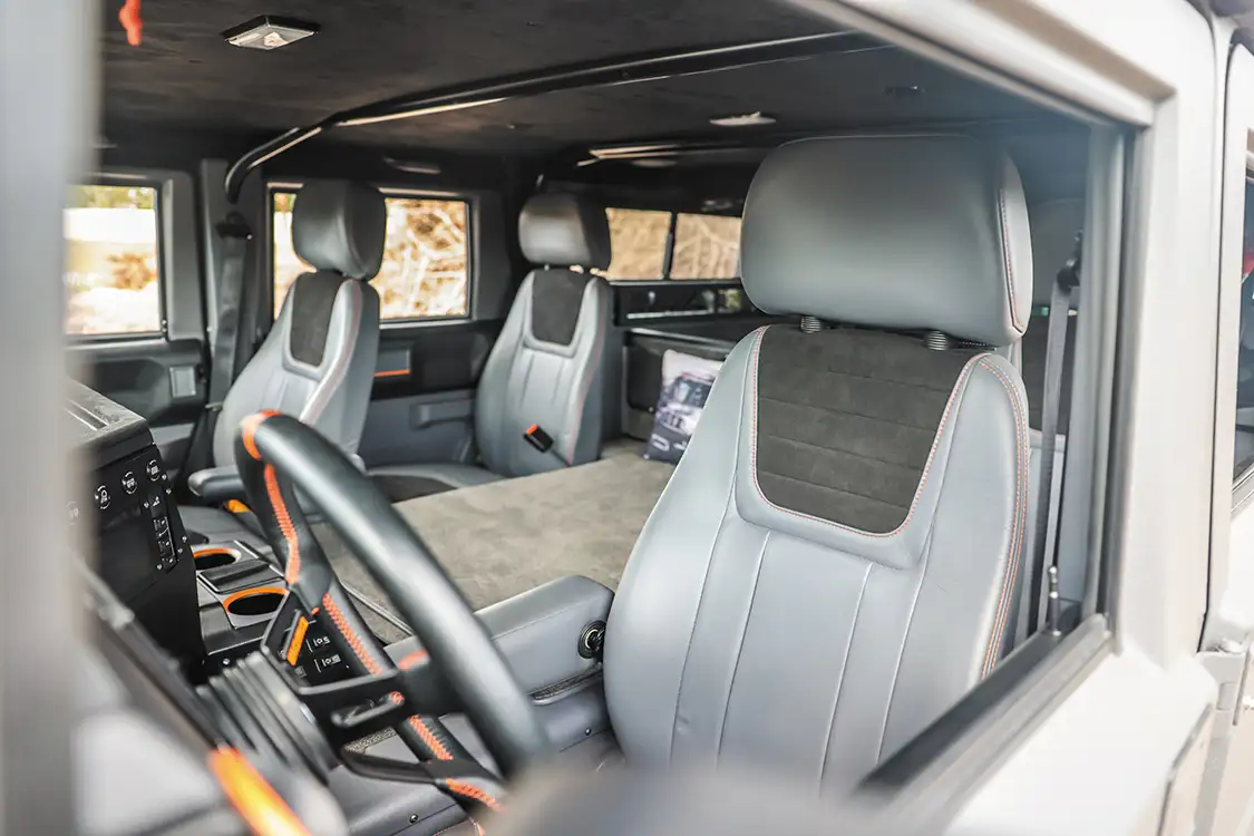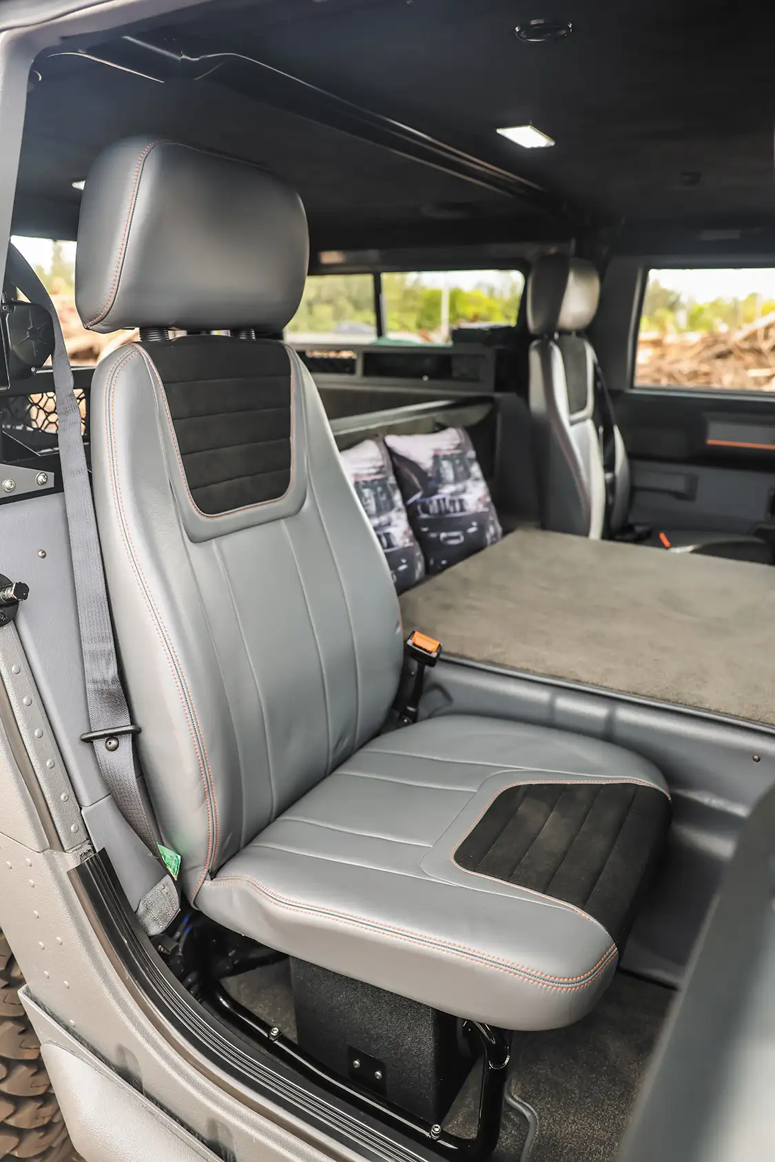 The outside is coated in Destroyer Gray with a heavy-duty Raptor liner finish—rugged, easy to clean, and mean-looking in any light. Harley Laprade handled the paint and bodywork, and the result is a finish that looks as tough as the truck really is. Rigid lights are tucked in everywhere: underbody, roofline, front bumper, and rear corners—because whether you’re deep in the backcountry or showing off at night, this truck stays lit.