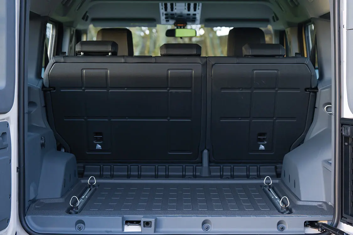 Interior-mounted L-tracks and associated rings allow for easy luggage tie-down points to secure cargo before off-roading.