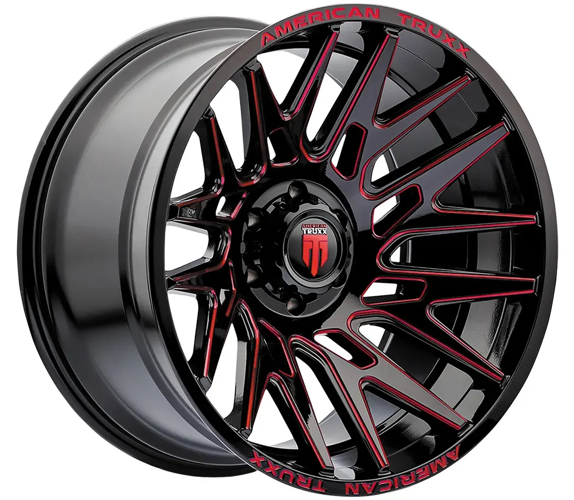 Bold and sure to turn heads, the AT1919 Evolution is a statement in style. The concave directional split-spoke design and the debossed “American Truxx” on the lip will help your vehicle cut through any crowd. The Evolution is offered in 22×12 in Gloss Black W/Milled Spokes or Gloss Black W/Red Milled Spokes.