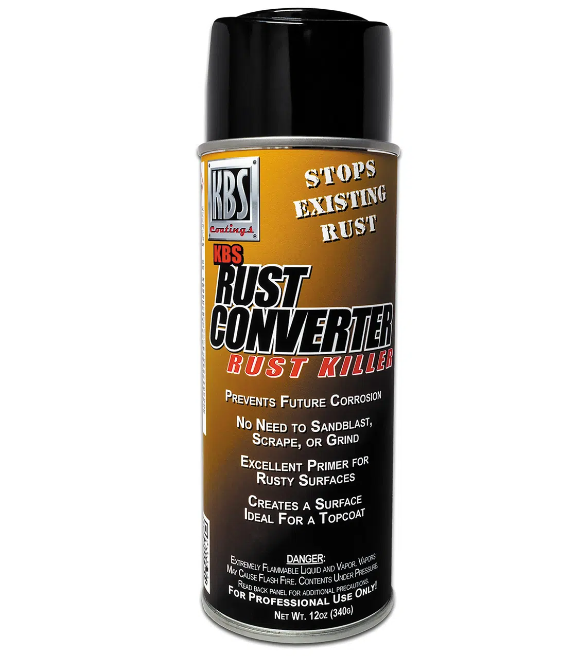 KBS Coatings Rust Converter chemically converts rust into a permanent, hard, and highly durable black surface. KBS Rust Converter is directly sprayed onto any iron or steel object that has tightly bonded rust, or surface rust, to kill the existing rust and stop new rust from forming. This quick drying Rust Killer forms an inert primer layer that can stand alone or be painted over.