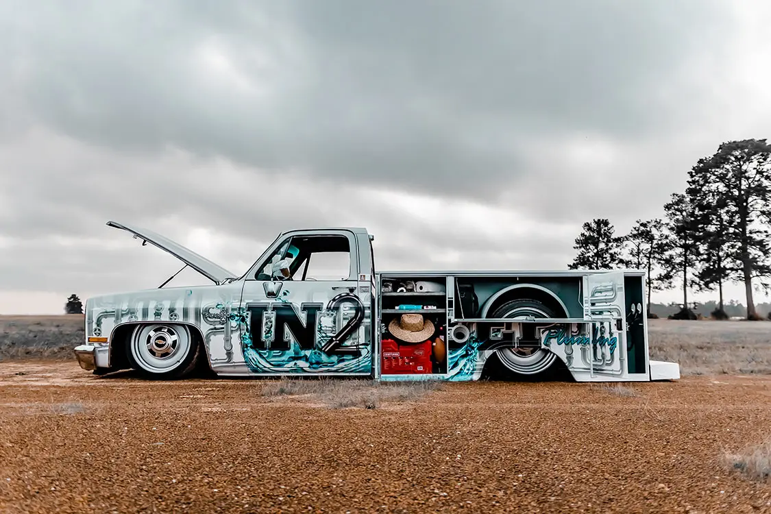 Jarrod scored an outrageously sweet deal scooping this truck up. Don’t get too jealous, but he found it on the side of the road for just $800 after it was repo’d. It wasn’t in too bad of shape, but obviously needed some work. He and his buddies went through the whole thing frame-up, fixing the utility bed and getting it ready to rep his plumbing company—In 2 Deep.