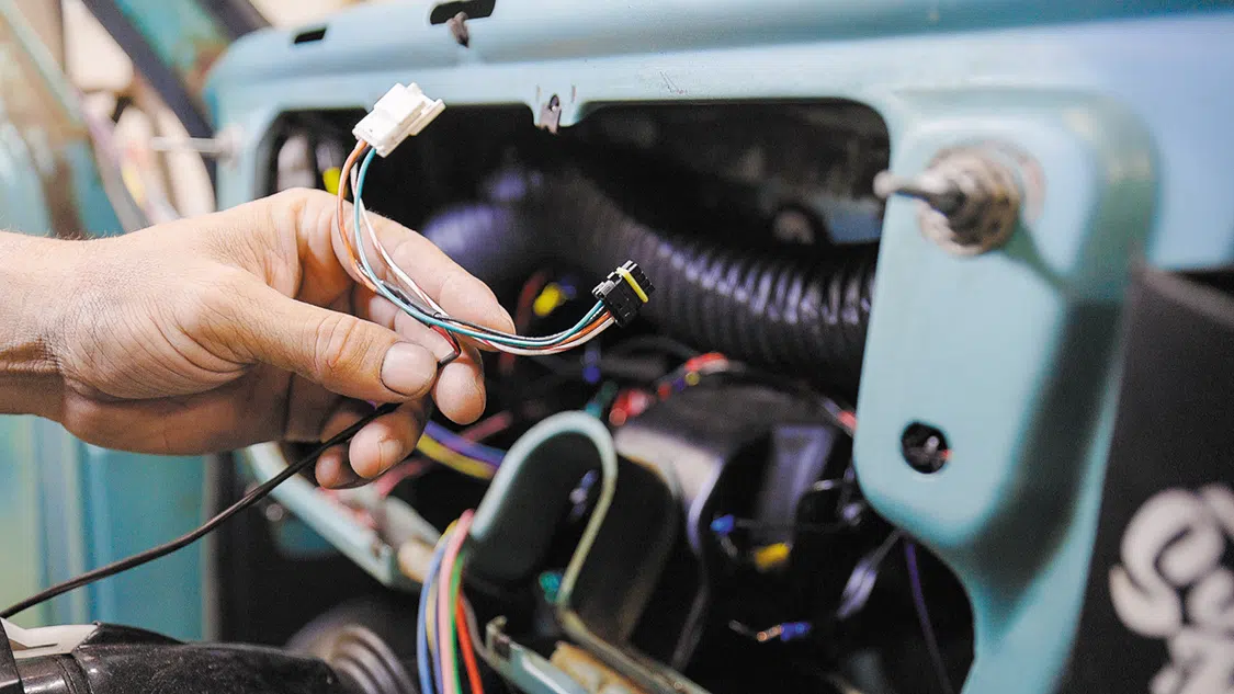 To get started on this install, I dropped the steering column to remove the original gauge cluster.Once the original cluster was out of the way, we could find a location for the Holley BIM and Dakota Digital control box. I chose to mount the control box on top of the brake pedal support bracket and the BIM on the custom-made fuse block bracket.Now that I had an idea on how everything was going to sit, I could start wiring the control box. I started by running the supplied harness from the CAN bus plug of the Holley system to the BIM then to the Dakota Digital control box.