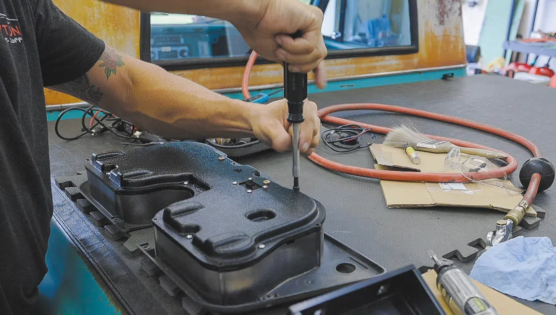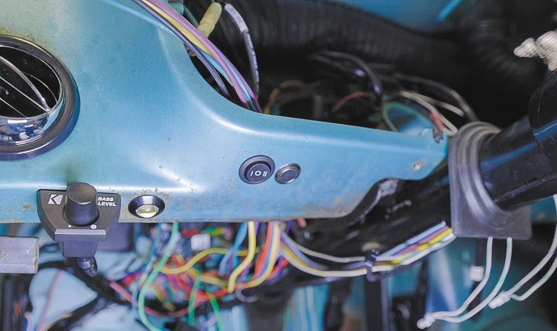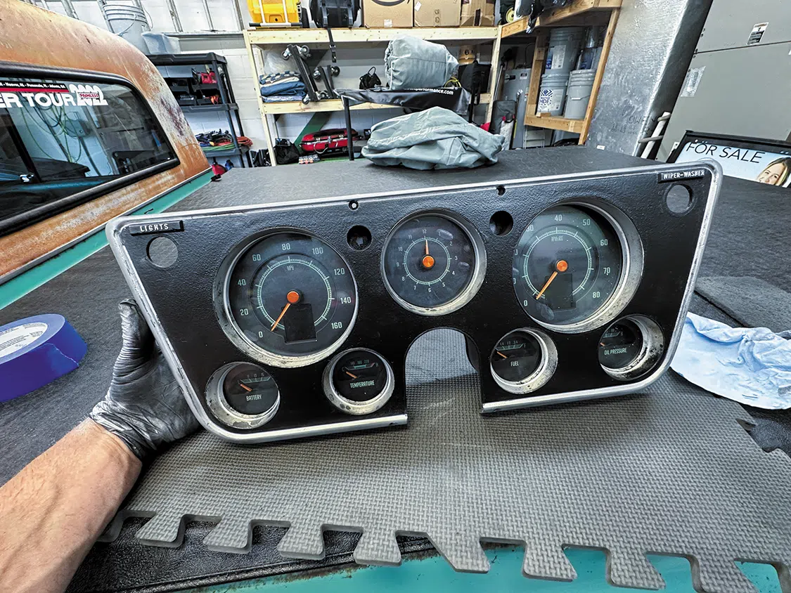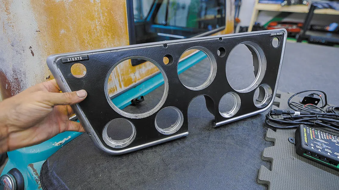 Next, I connected the ignition power, 12V constant, ground, fuel, dimmer, high beam, left turn signal, and right turn signal wires to the control box—and that was it for wiring! I also installed the buzzer on top of the control box.Then I was thrown a curve ball. I thought initially this BIM was plug-and-play, but you must do a few things for it work. I had to get a laptop (PC) to download the Holley EFI software to change the CAN bus type to “Racepack.” You cannot do this from the Holley handheld screen and must do it through its PC software (not supported for Mac that I have found).Now that I had the software for the Holley EFI system, I had to update the handheld screen and Holley ECM for it to accept my modified tune file. Holley has a great video on how to do this process. Check it out buy scanning the QR code above.I then found a location for the Dakota Digital switch right next to the line lock button on the lower section of the dash. You could mount the switch with the provided bracket, but I decided to mount it through the dash. The opening needs to be 13/16-inch but I did not have the right size step bit on hand. I drilled a ¾-inch hole and slightly widened it with a bur bit in my die grinder and installed the switch.The switch will not be visible when looking into the truck but will be easily accessible from the captain’s seat. This switch allows you to change the display selection, reset readings, and set up the various system parameters.Next, I hooked up the main data, turn signals, clock, and buzzer cables to the back of the gauges and powered them on for the first time.I fired the truck up an noticed the gauges were pulling the data I wired to the control box but not pulling data from the BIM. Once I did some more reading in the instructions, I discovered I also need to program the BIM to read the data from the Terminator X Max.I then needed to program the gauges for each data point I wanted the gauges to read from the BIM. Going down the setup menu, I programmed speed, RPM, engine temperature, and oil pressure to read from the BIM.I also went ahead and programmed the backlight colors for day and night mode. Night mode is activated when the headlights are turned on via the DIM wire on the control box.I fired the truck up again, and the gauges immediately pulled all the info I needed. After making sure all of the data was reporting correctly, I could install the gauges and reassemble the dash.I was able to source an original seven-hole bezel (the original one was only three) and patina it to match the interior.Next, I secured the cluster to the bezel and got the first glimpse of what these will look like in the truck.You can hardly tell a difference in the new one versus original one at first glance, especially with this patina bezel.Once the gauges were installed for the final time, it was time for a test drive.I noticed right away the speed was accurate and the odometer started to roll. I reference the engine vitals on the Holley handheld readout and it was reporting accurately on the instrument cluster.Now that this installation is complete, I can fine-tune these gauges to my liking. What I like the most about this install is that it does not take away from the look of the interior. You probably wouldn’t even know this is a brand-new setup of gauges behind that patina bezel. I love having the factory look with modern features.
