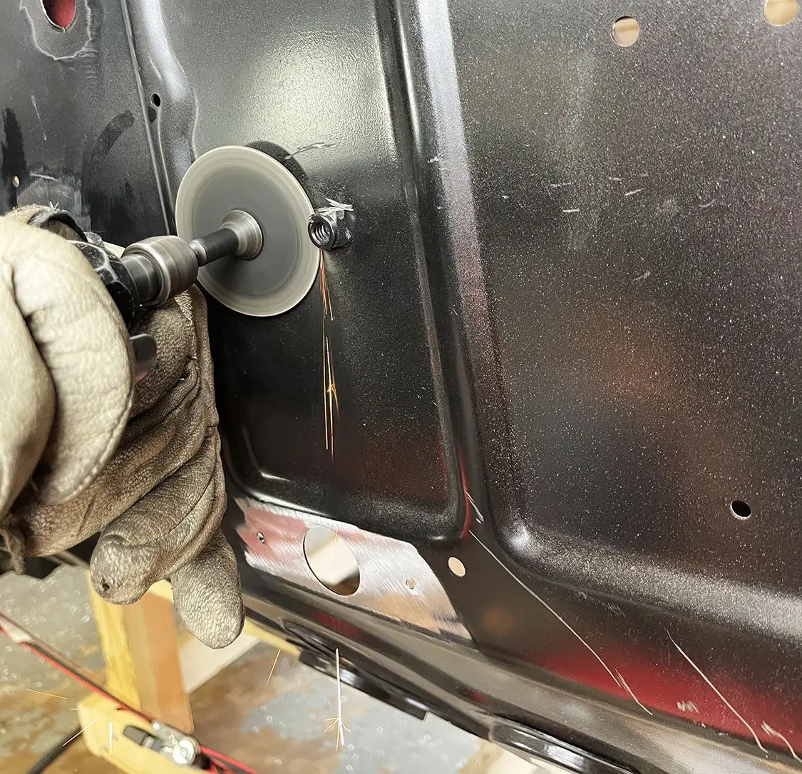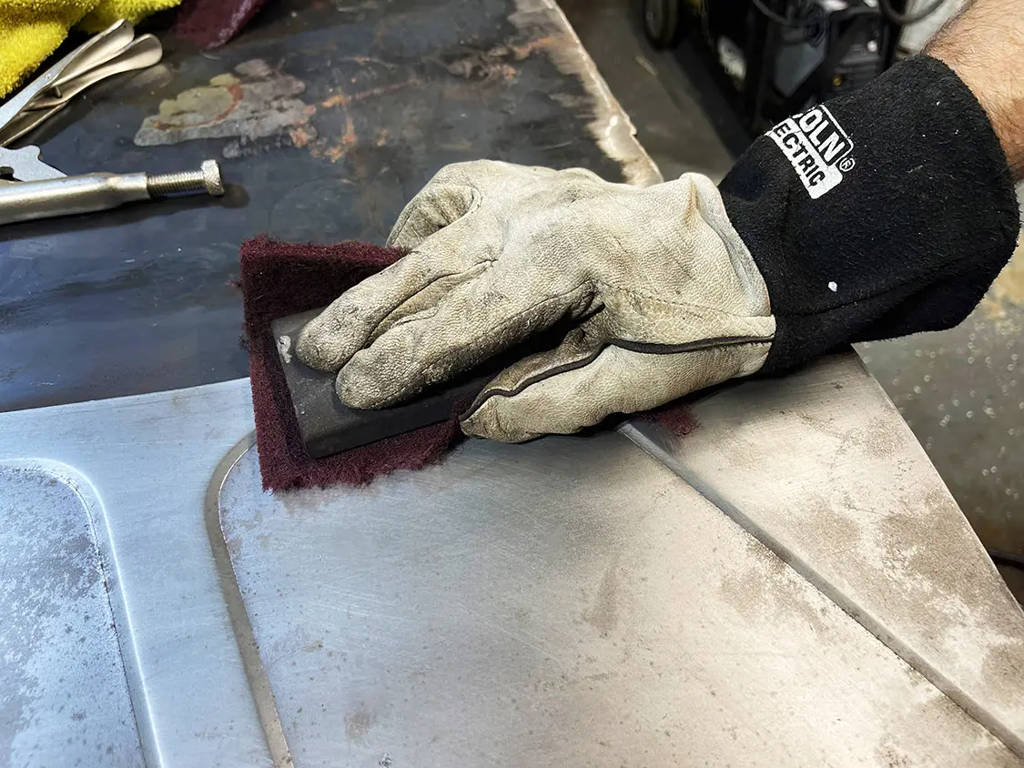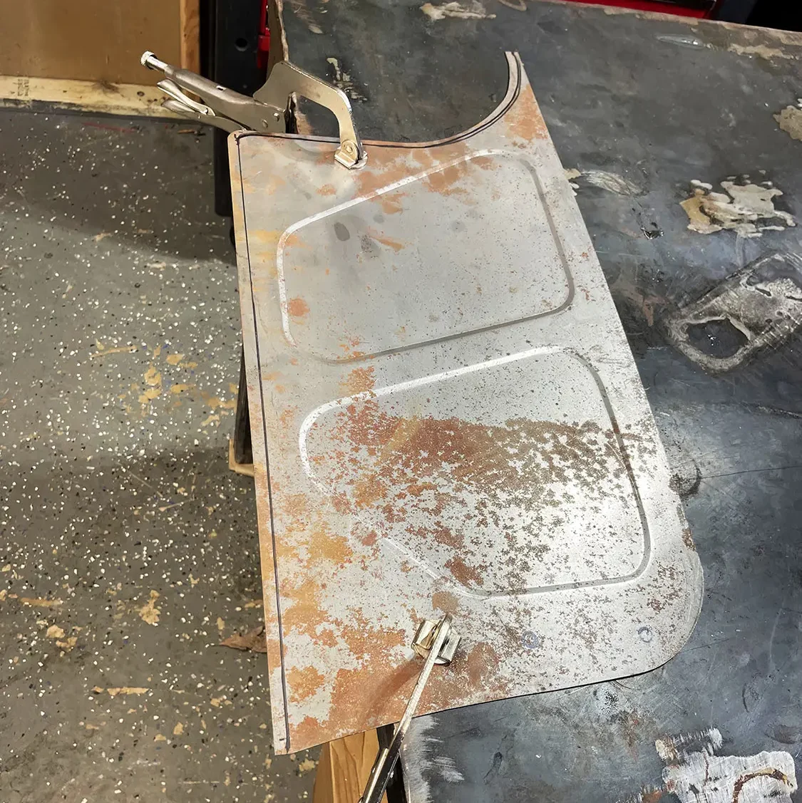 04. To safely and accurately make the cut along the lines, the panel was securely clamped to a table at each side. After making sure the panel wouldn’t shift when allowing pressure, Devin used a sheetmetal air shear to trim around the panel with ease.05. Once the panel was completely trimmed, Devin gave it a good once over with a scouring pad to promote better weld adhesion once it was time.