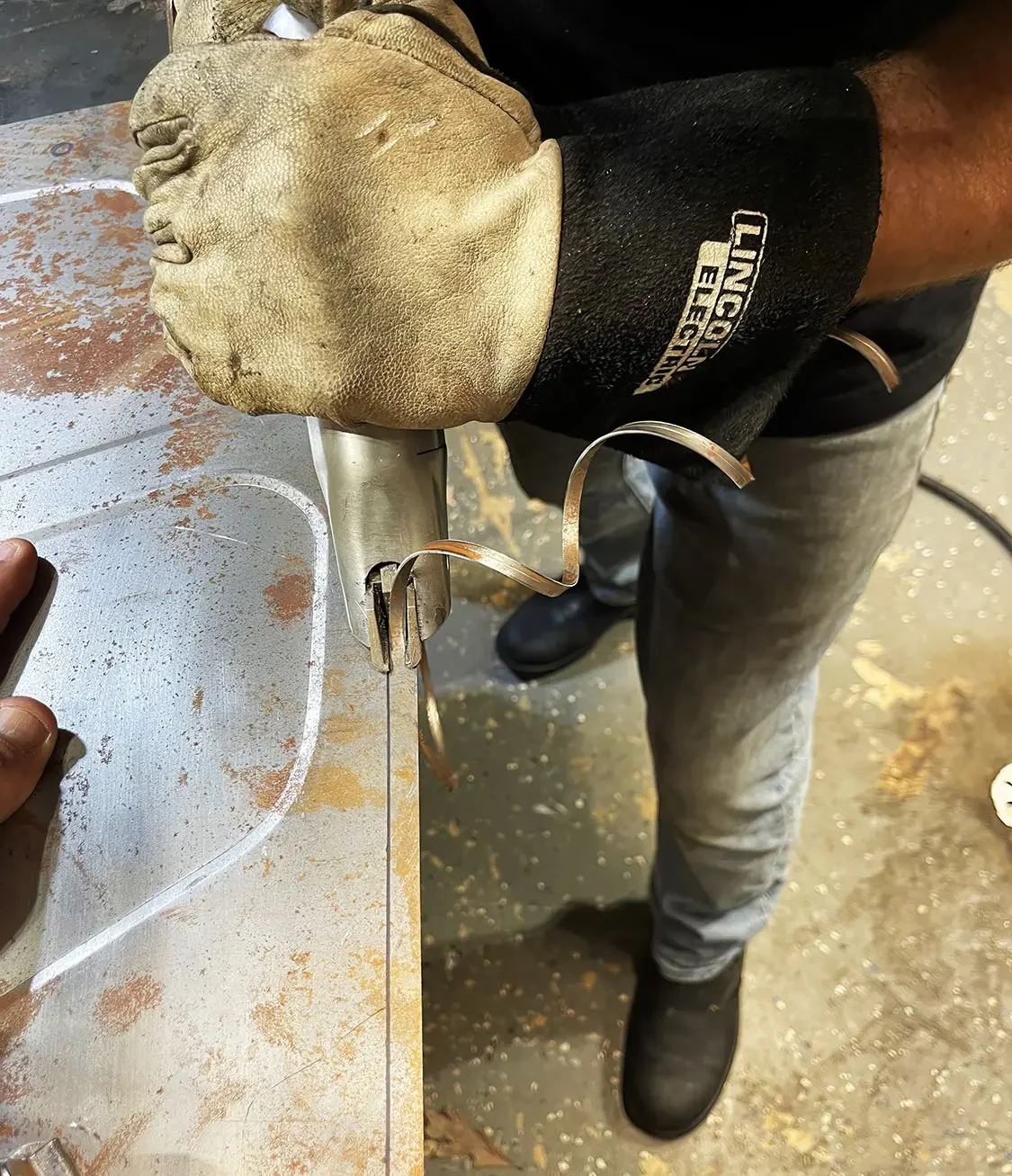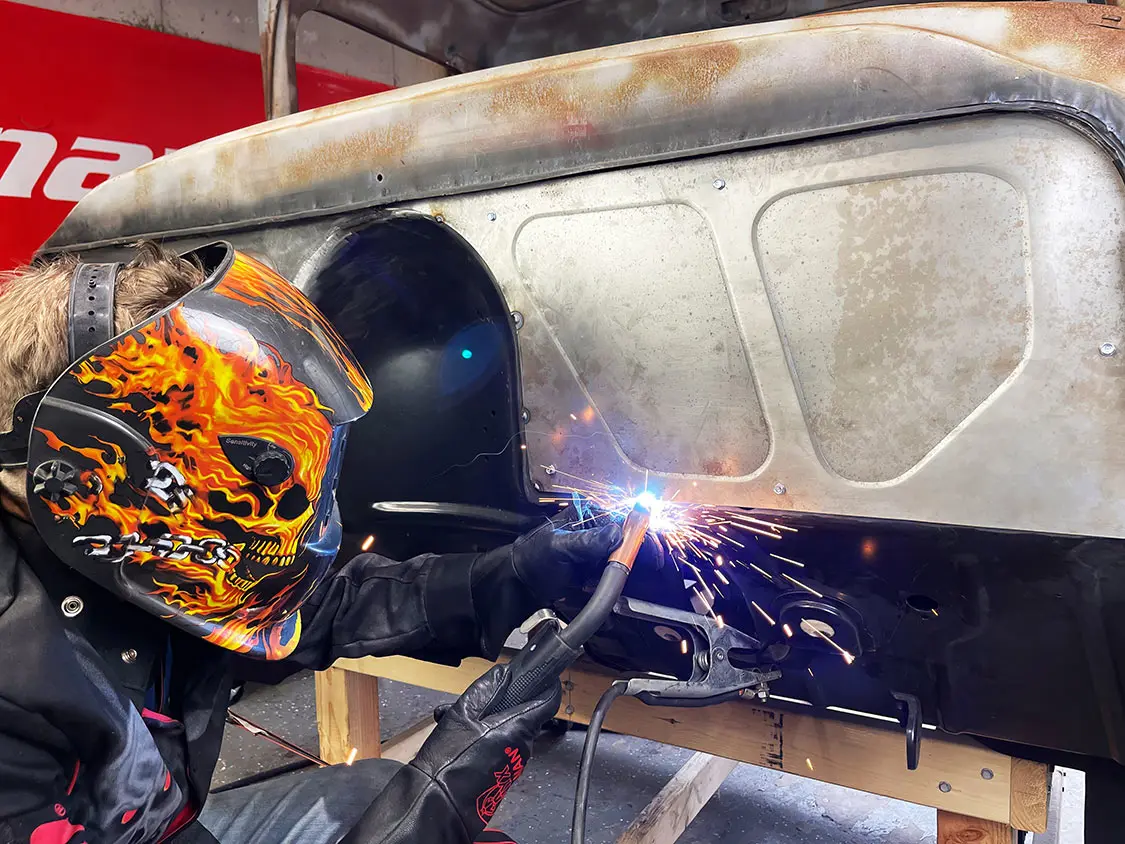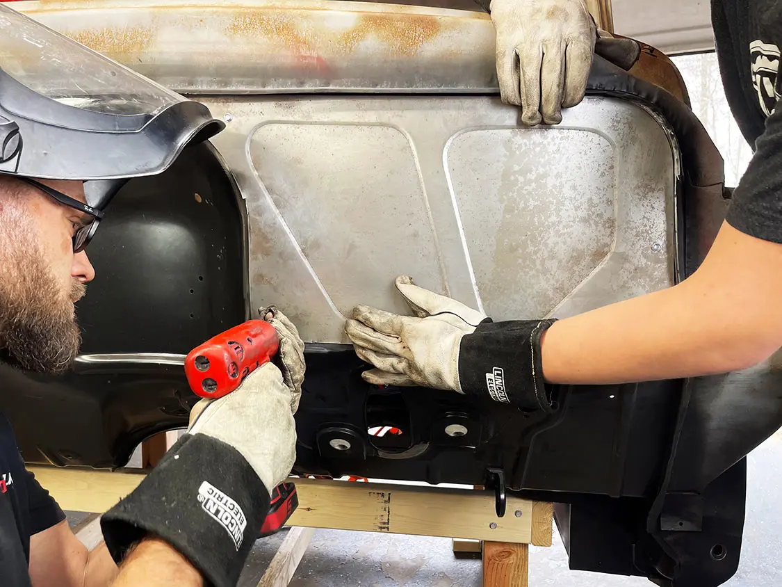 04. To safely and accurately make the cut along the lines, the panel was securely clamped to a table at each side. After making sure the panel wouldn’t shift when allowing pressure, Devin used a sheetmetal air shear to trim around the panel with ease.05. Once the panel was completely trimmed, Devin gave it a good once over with a scouring pad to promote better weld adhesion once it was time.