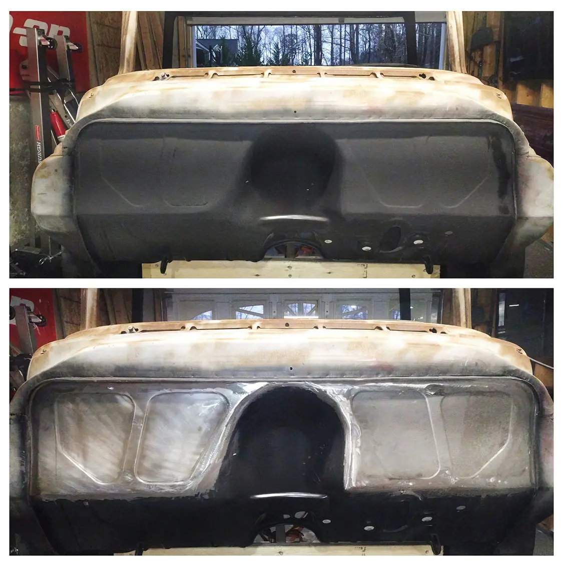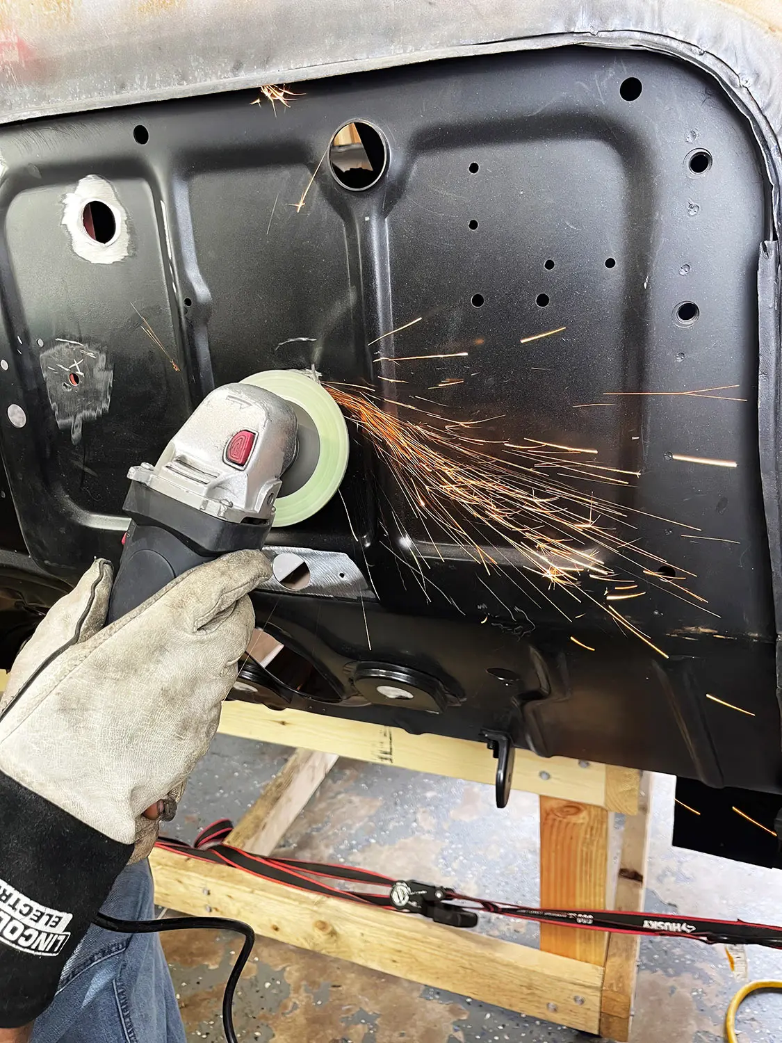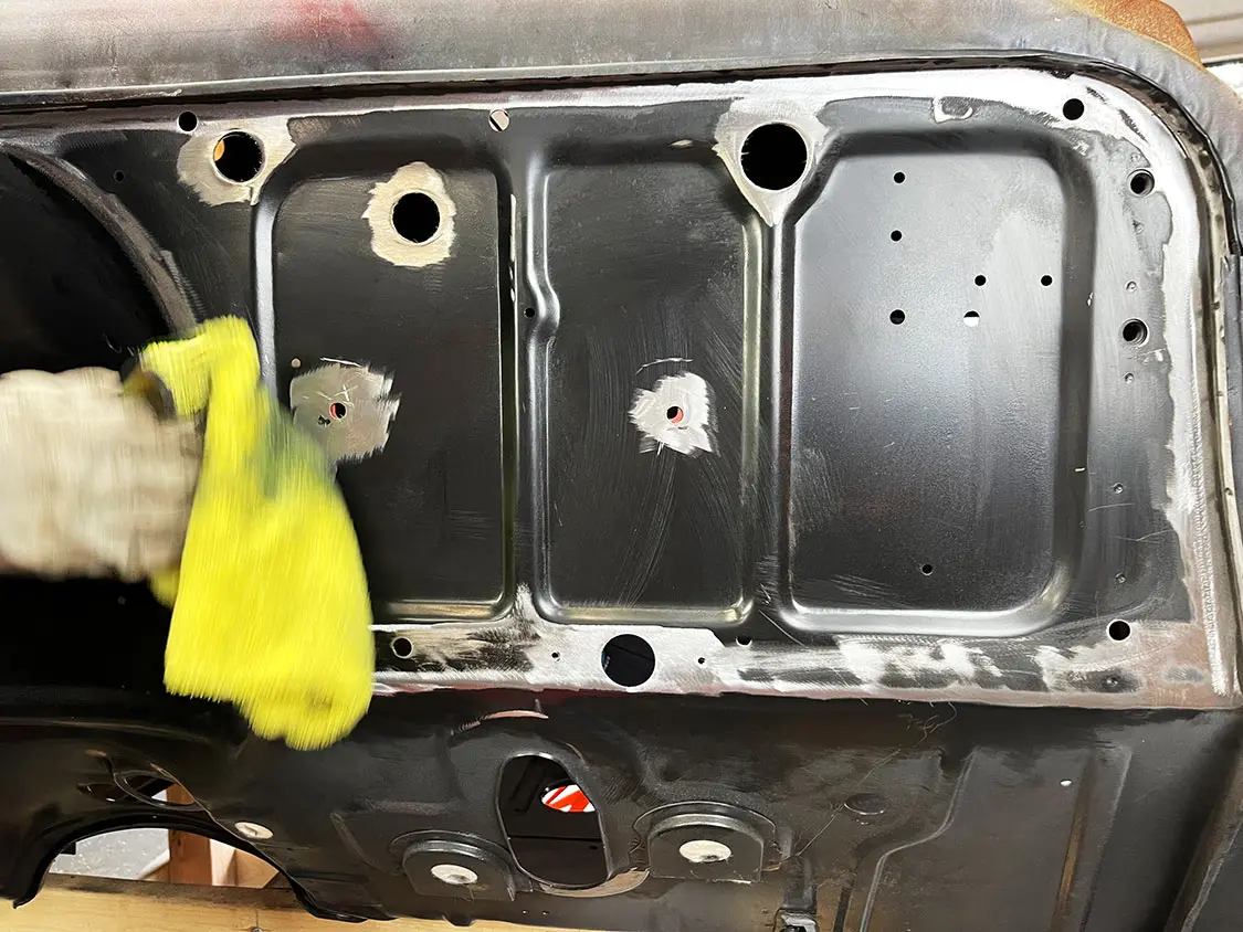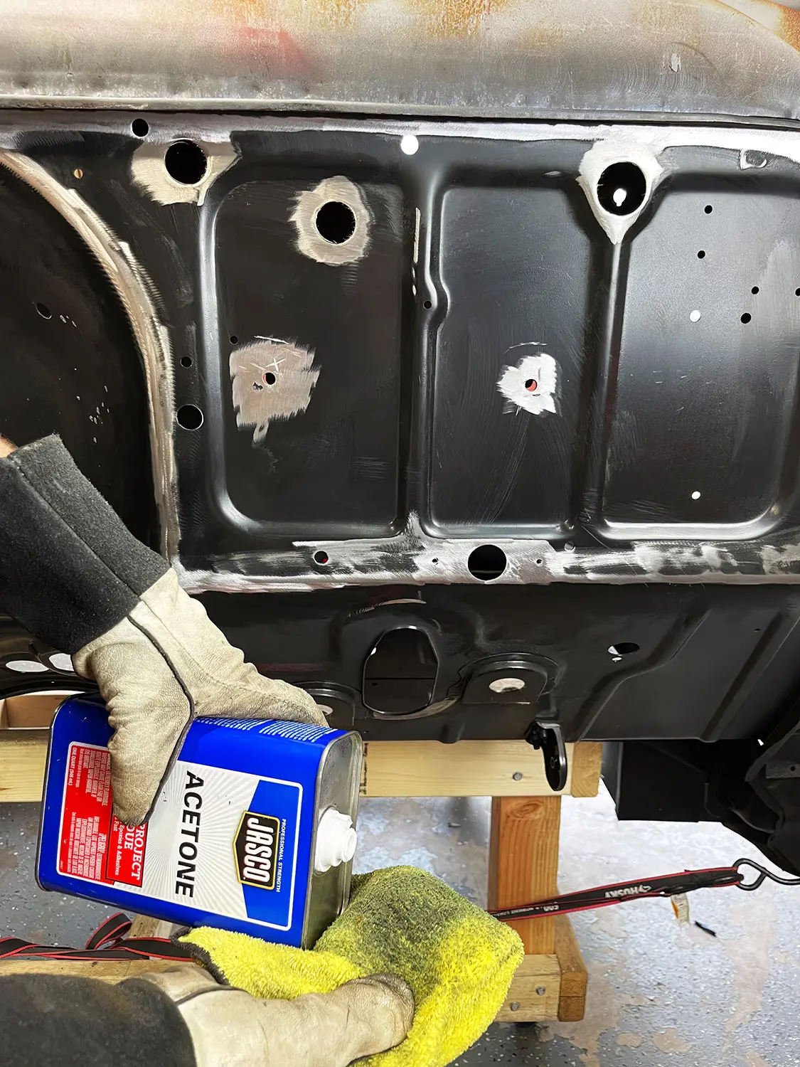 06. To further prepare the stock firewall for installation of the filler panel, Devin then used a grind wheel to take the area down to bare metal where he planned to make his welds.07. To clean off the dust from the grinding and leftover grease from the firewall, Devin rubbed it down with acetone to fully prep it before welding the filler panel into position.