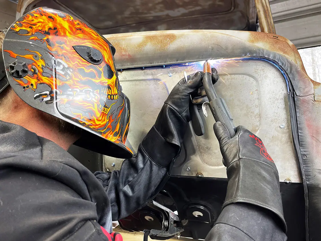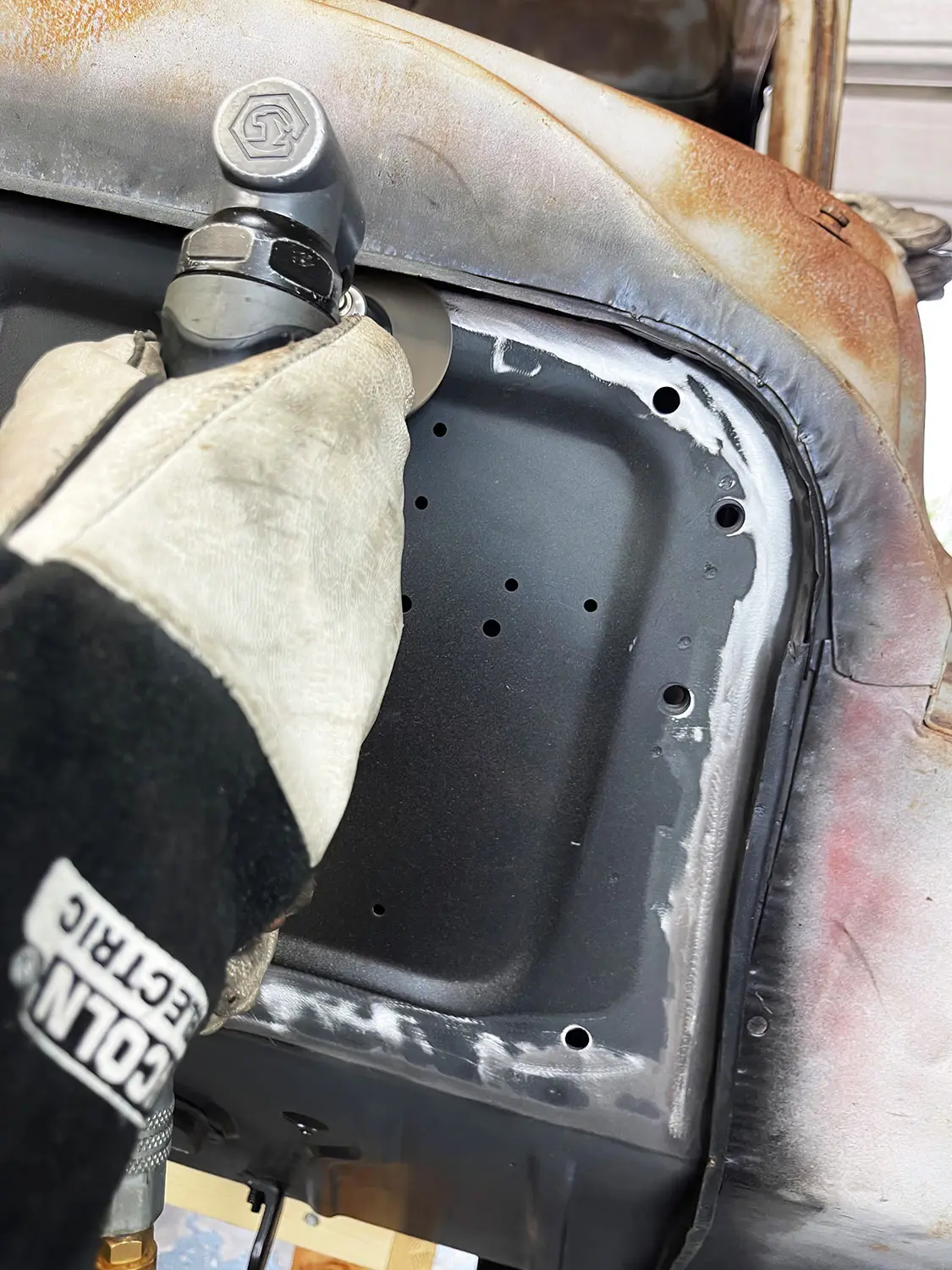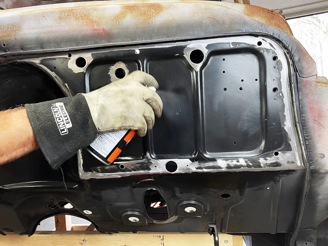 08. Next, Devin began to spot-prime some of the bare metal areas to protect them from rust before this surface would be covered up for good.09. The Slosh Tubz firewall filler panel for the driver side was held in place and secured with a handful of self-tapping sheetmetal screws, which will be removed and filled.10. Next, Devin slowly began moving around the panel, spot welding it on all sides.