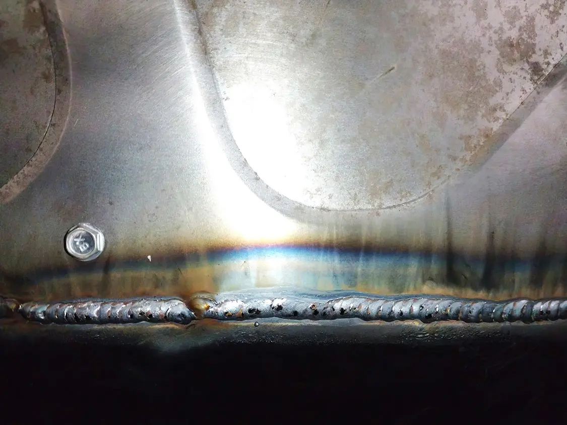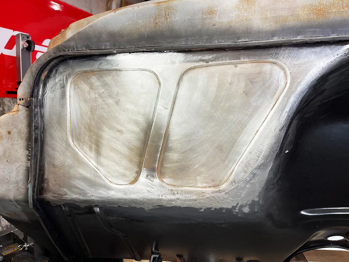 02. Devin removed the port and took down the hole to bare metal. He also shaved the other holes with protruding lips that would soon be covered by the Slosh Tube filler panels.03. Next, Devin placed the filler panel over the area where it would be permanently welded to get an idea where he would have to trim it. He traced a line along the bottom and the side where it could be cleaned up to fit more precisely.