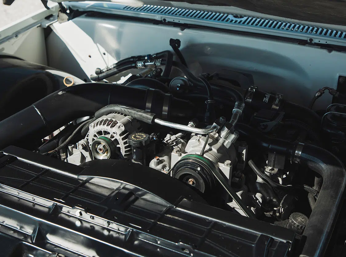 Jonathan touched on this, as they had to go above and beyond to ensure the A/C lines fit properly because the new motor was too tall to include the stock A/C lines as they sat. His buddy Ryan Heyd figured out a way to make the stock factory lines work with cold hose fittings! Having seen quite a few engine swaps in our time, it’s always super refreshing to see something look “stock.” Taking a glance at the exterior, you’ll notice that all of the badging has been replaced with some epic billet badges, the door handles are all billet, and even the cab trim has been swapped to billet too! Keeping in theme with the brushed/billet look, the staggered Raceline wheels (22×8.5 and 24×12) feature a mix of brushed and polished finishes to match everything else. Underneath lies an Accuair air suspension system with a custom four link in the rear, done by Jose Pena of DRU Customs out of Deer Park, Texas.