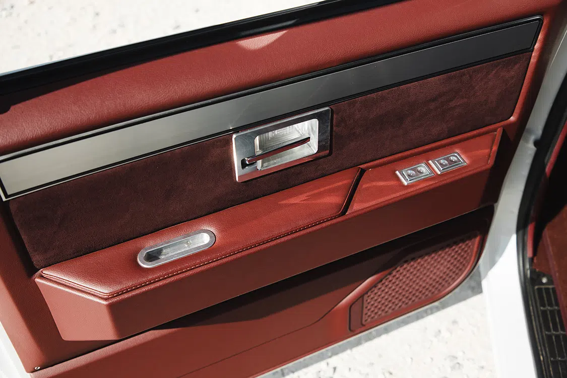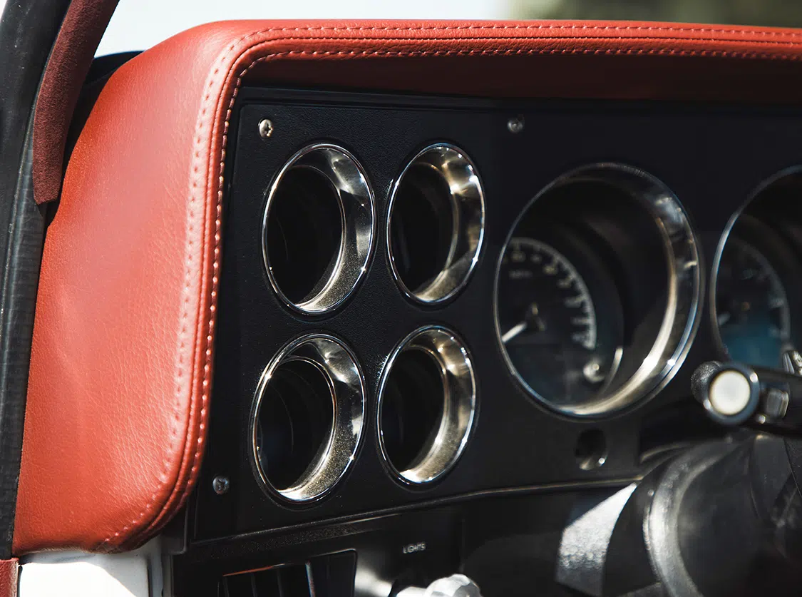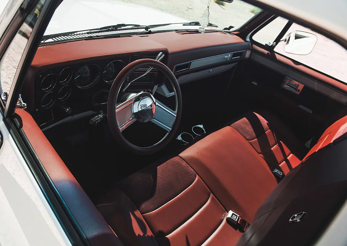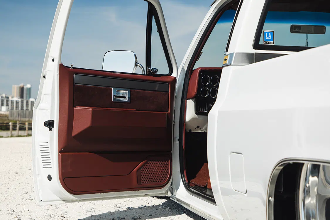 One of our favorite parts of this truck is the interior. Opening the doors revealed a lovely Nuance merlot suede interior, which was absolutely incredible. There’s also no shortage of billet here either. You’ll notice the door pulls, the window buttons, cup holders, gear shifter, and even the air freshener are all billet! Wesley Cato of Anything Car Audio and Upholstery is the guy to blame for such a beautiful interior. There’s a matching Raceline steering wheel, as well as a custom sound system that has a shallow subwoofer tucked beneath the bench seat! Keen viewers may even catch the hidden tweeters tucked away near the air vents. We seriously did love this interior—there’s something about the color that had us entranced.