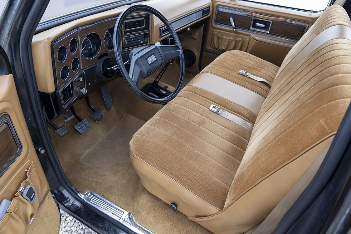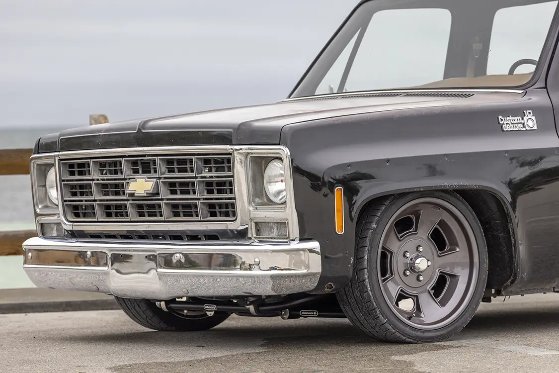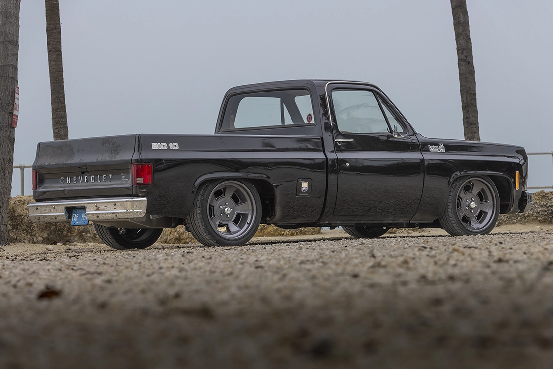 The factory short bed frame was left untouched, but it’s now riding on a Ridetech coilover system with Eibach springs and Fox shocks. CPP modular spindles handle the front, while Wilwood 6-piston (front) and 4-piston (rear) brakes bring it all to a stop. The steering system is upgraded with a quick-ratio Borgeson box, and everything rolls on 20-inch Halibrand ‘Sprint’ wheels wrapped in Nitto G2 555 rubber.