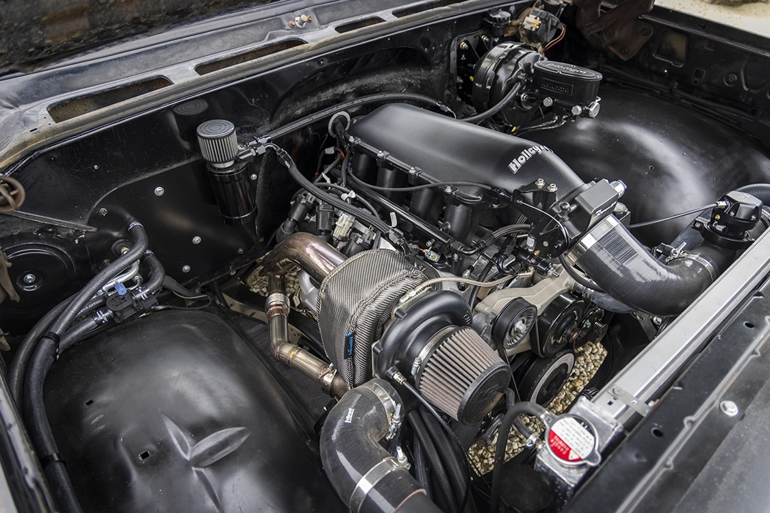 Under the hood is a 383ci V-8 stroker built by Ohio Crankshaft. It’s stuffed with Wiseco -15cc pistons, ARP hardware, a forged crank, and a Brian Tooley Racing Stage IV Turbo Cam. Air flows through a Holley Hi-Ram intake with a 92mm throttle body, and a BMF 76/75 turbo sits on a Fahler T4 manifold. Holley’s Terminator X keeps everything in check, while a Mishimoto intercooler chills the boost.
