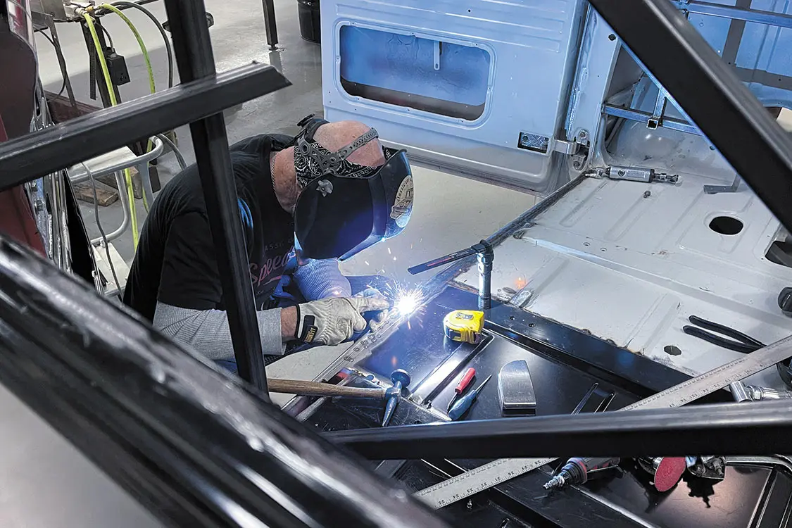 The factory chassis had served the F-600 well throughout its years of dedicated labor, but so much more was in store for it with its scheduled reincarnation. Once the OE frame was removed from under the cab, it was loaded on the first truck headed to the scrapyard. CCS resident fabrication gurus Scott France and Mark Siddle designed an all-new, one-off foundation for the Ford that features a front Porterbuilt dropmember sub-frame complete with tubular control arms and Detroit Speed rack-and-pinion steering. The back of the chassis was outfitted with a Porterbuilt 4-link kit as well as a narrowed 14-bolt rearend. Air ride was always in the cards for this project, and to allow the ’56 to boast a fully adjustable ride height, Goodyear ‘bags along with Accuair air-management components and Viair compressors were properly plumbed and wired.