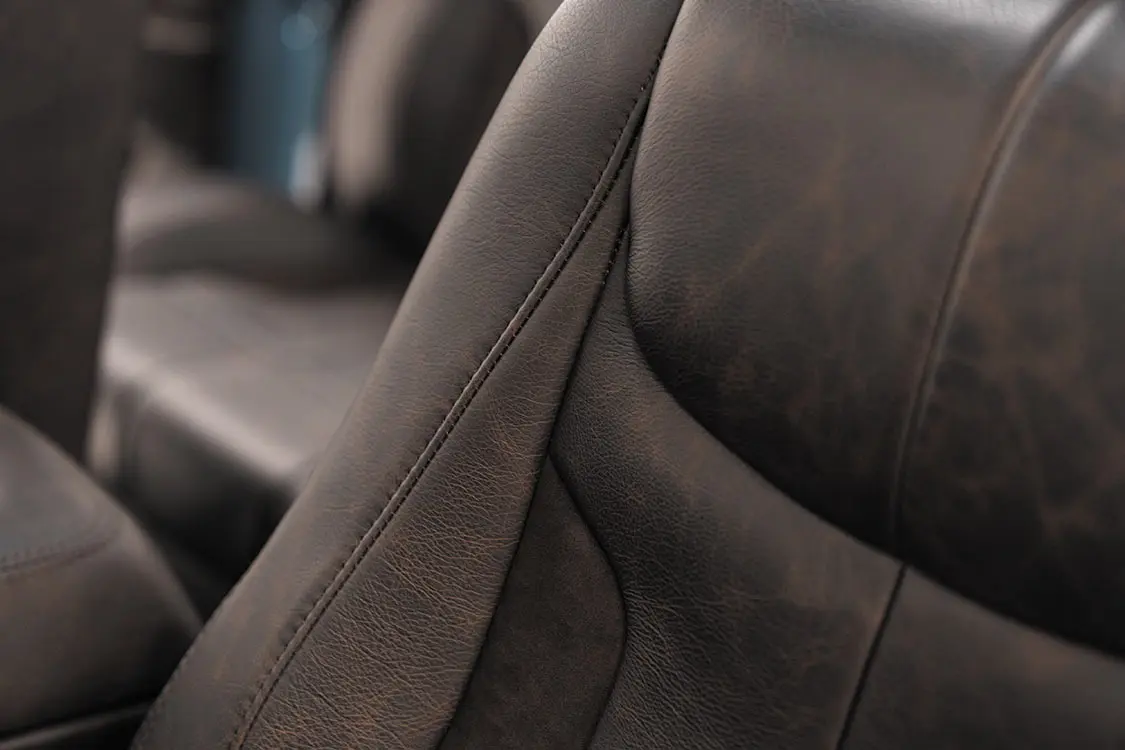 Next, CCS’ in-house upholstery specialist Laura Semaan began heavily upgrading the Snowden seat bases. The foam was meticulously shaped to give the exact form she was after. Exquisite seat covers were then sewn together with chocolate colored Relicate leather skins that proved to be the perfect finishing touch for the front buckets and rear bench seat. To further promote the interior’s cohesiveness, Laura also fabricated matching door panels complete with zebra wood inserts, which can now be found all throughout the F-600’s exterior and interior landscapes. A network of Kicker audio components was wired and stashed behind the rear seating area, and a one-off sub enclosure lurks below. Old Air Products climate control was also added to the list of in-cab amenities to ensure a pleasurable drive during all weather conditions.
