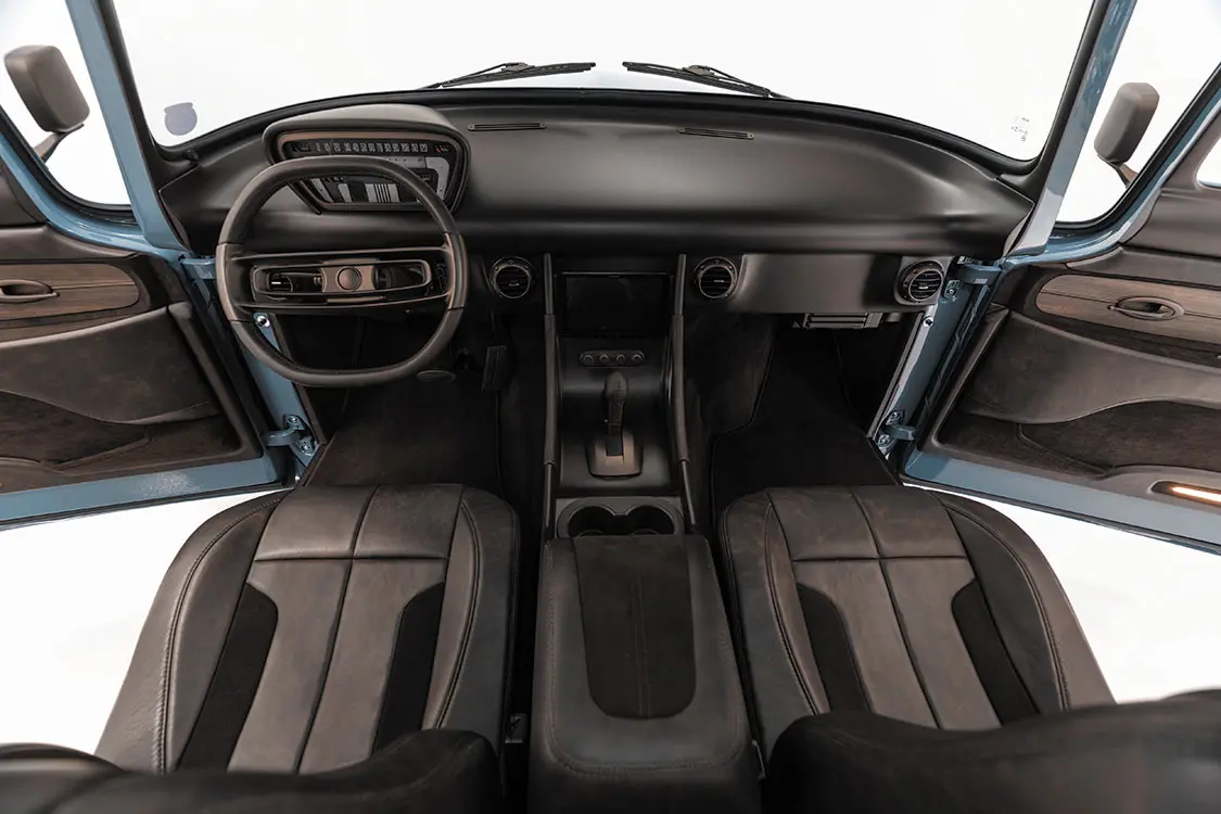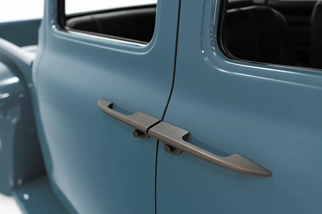 The owner of the F-600 selected Area 51 Blue—a factory Ford paint color to cover the exterior of the of the truck. Even though the hue is a more contemporary selection used on late-model Bronco and pickups, it looks right at home on the ’56. Soon after the paint dried and the multiple layers of clearcoat were buffed to a mirror-like shine, fabrication and interior work immediately began within the confines of the newly expanded cab. Scott and Mark fabricated a custom center console and metal dash with an opening designed specifically to house a Dakota Digital gauge cluster. A custom bronze paint was then used to cover the dash, upper halves of the inner doors and pillars, as well as the console, steering wheel, and so many other smaller accessories.