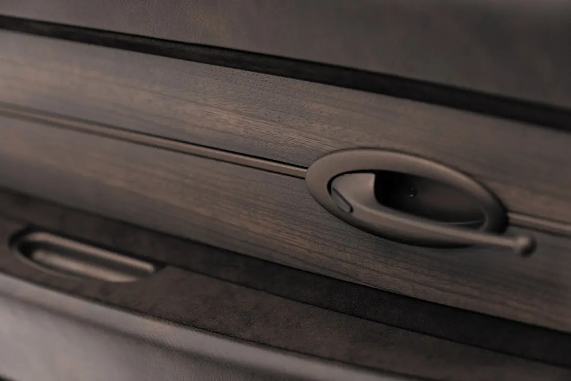 The chassis was outfitted with a body mount configuration much different than the factory F-600’s frame to accommodate a one-off crew cab that features a rear set of “suicide” doors and reinforced fabrication throughout, a handmade roof, floor, custom valance and grille section, and everything else imaginable. Not only was the quad cab specially designed for the project, but so was the bed that features unique rounded corner panels matched the cab for a façade that naturally flows from front to back. A curved opening was then cut into the bed floor to accept a slab of exotic zebrawood, which gives the truck that extra touch of class.