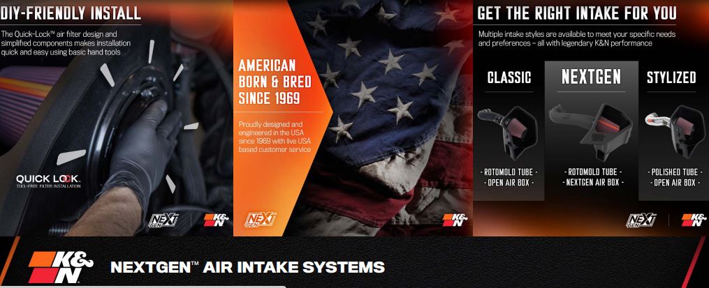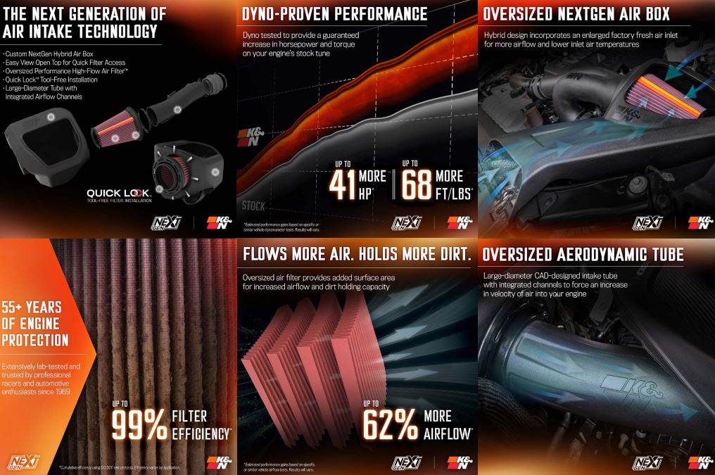 NextGen Air Intakes are advanced hybrid performance systems, engineered to deliver the perfect balance of cooler air, unmatched horsepower, increased airflow, and more torque—all wrapped in bold, modern styling that looks great under the hood. K&N Engineering, the premier global manufacturer of industry-leading automotive filtration and technology, has announced its newest offering: the all-new NextGen Air Intake Systems. NextGen intakes are designed to deliver the most horsepower on a stock tune for today’s most popular trucks, Jeeps, and SUVs. Drawing on over 50 years of expertise, NextGen Air Intake Systems target closed-box buyers looking for a superior intake solution that provides more power, protection, and style at a great value from a name they trust. The all-new hybrid open-top design features an enlarged factory fresh air inlet, optimizing airflow and lowering inlet temperatures for superior efficiency. With smoother, more consistent airflow at higher volumes, drivers can expect their engine to roar with increased performance. Installation is fast and hassle-free, requiring only basic hand tools. NextGen Air Intakes embody K&N’s commitment to innovation, ensuring drivers get cutting-edge technology that outperforms the competition.