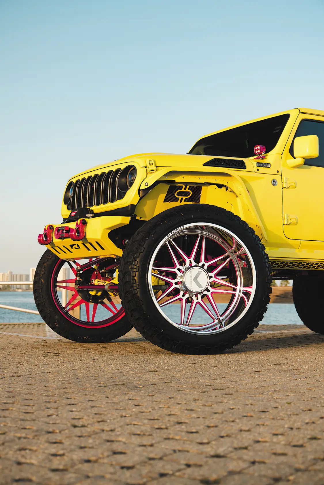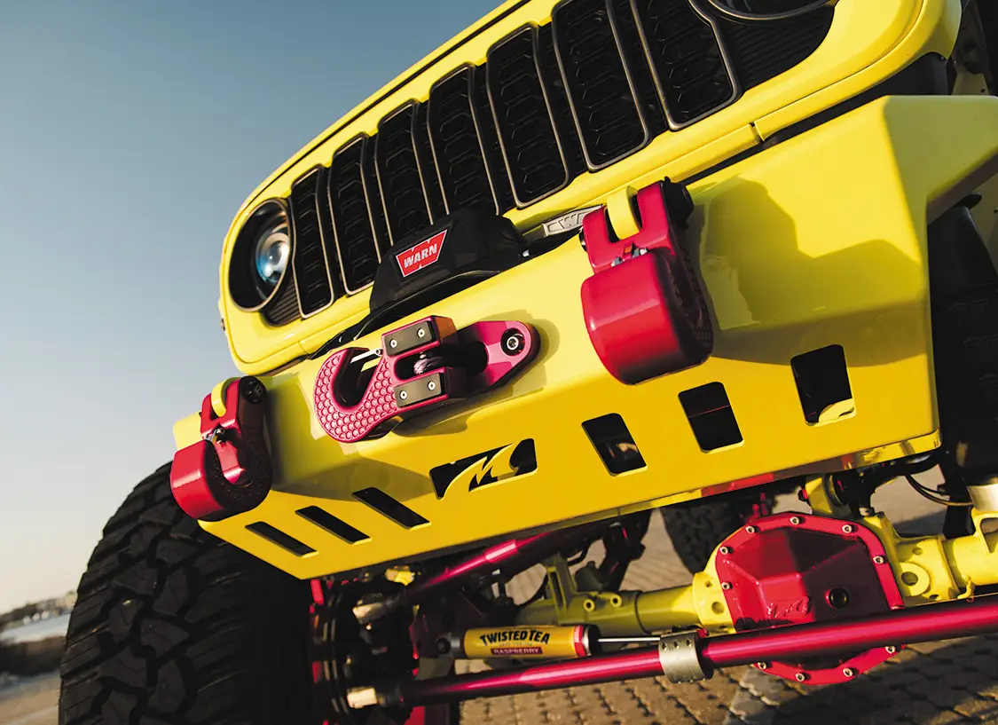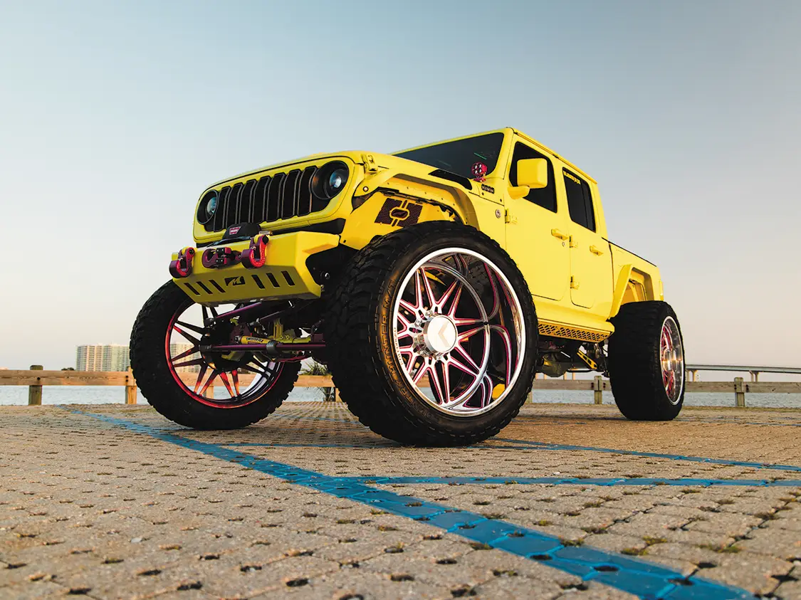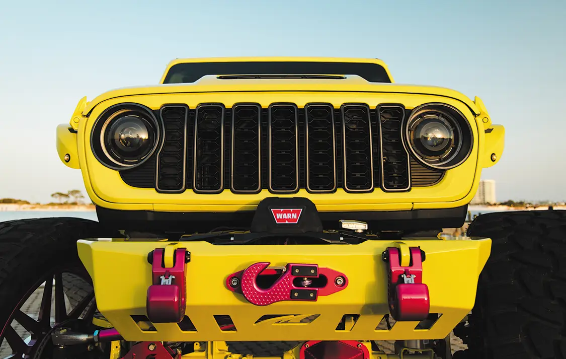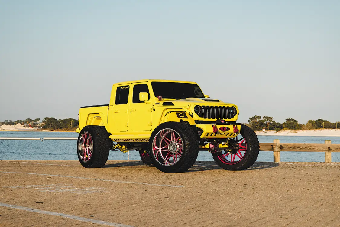 For such a big vehicle, it drives easily, rides nice, and shoots really well. Riding with Kyle to the shoot, the Jeep made all the right noises and sights we come to expect from your typical diesel build. The turbo spool, the dump of coal, the typical tractor grunts and groans, nothing is amiss with this Jeep. Somehow, we managed to be spared the pain of dealing with a million boat launches at the slip and had a stress-free shoot that netted us some awesome pics. The whole Jeep has been painted in High Velocity Yellow, with Prismatic Powder Illusion Pink on the accents, by Jeremy Forrest out of Slidell, LA. EOC Performance did a wonderful job color matching the engine bay to the custom paint all over, as well as installing a great sounding 3” exhaust. Did we mention the whole thing is on airbag suspension? Somehow Accu-Air made an air system that when aired out allows Kyle to stuff the 30×16 KG1 Forged Trickstars on 44 INCH tires all the way to the fenders and then gives him eight inches of lift from there when airing up. Supporting the air setup are some Triangulated Upper rear 4 link kit from Rock Krawler, as well as Elev8 control arms, all powdered of course.
