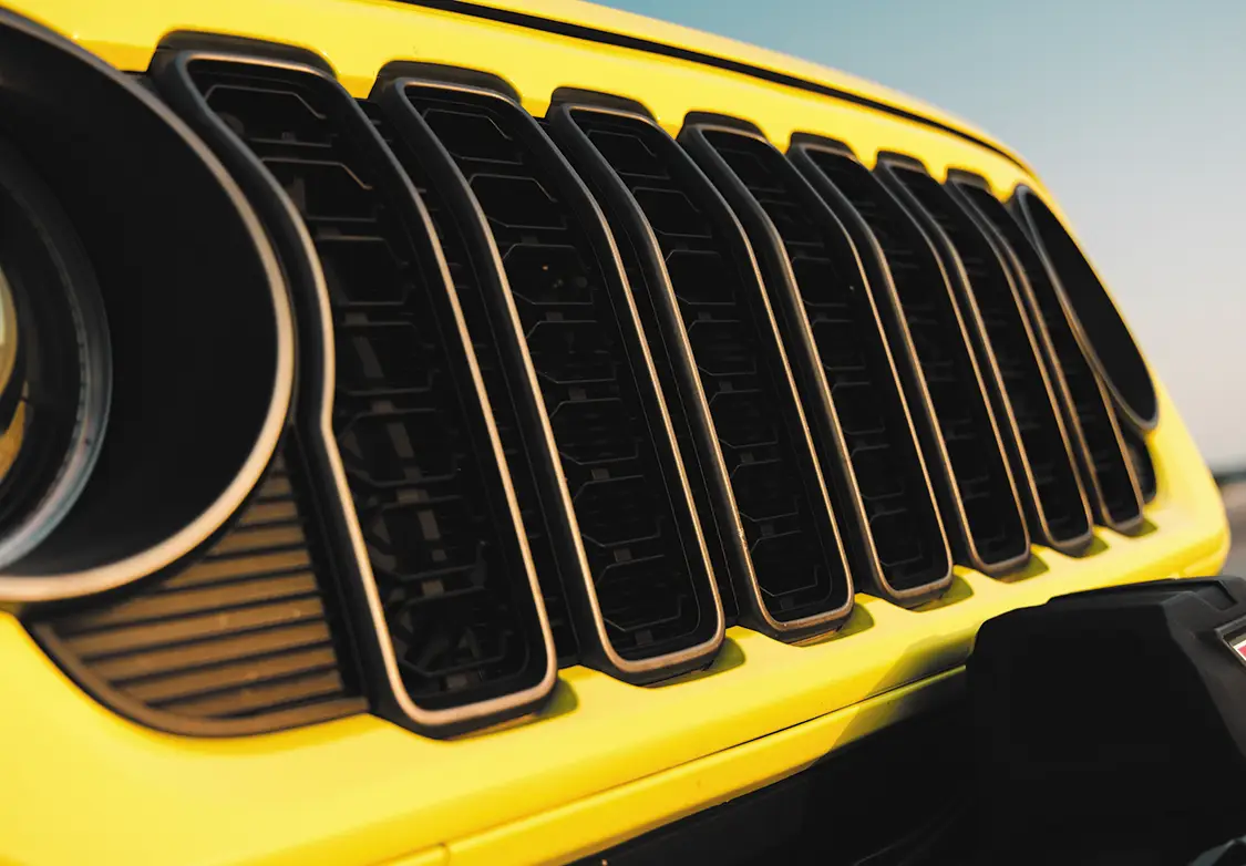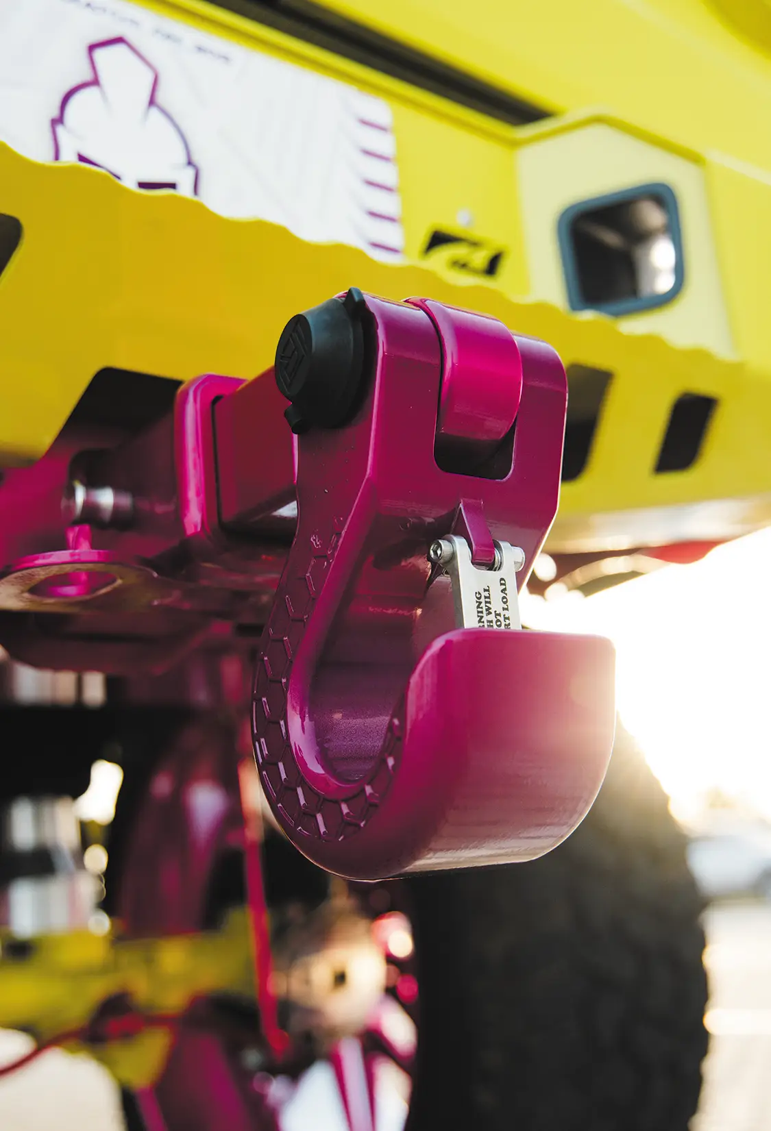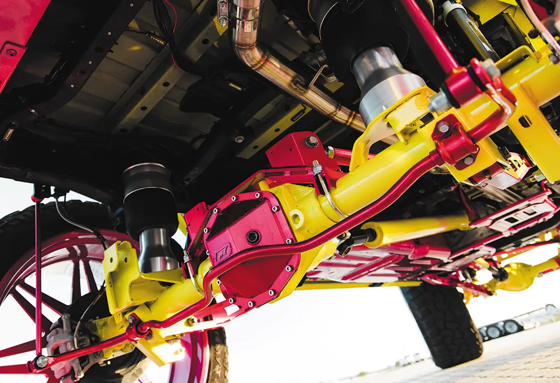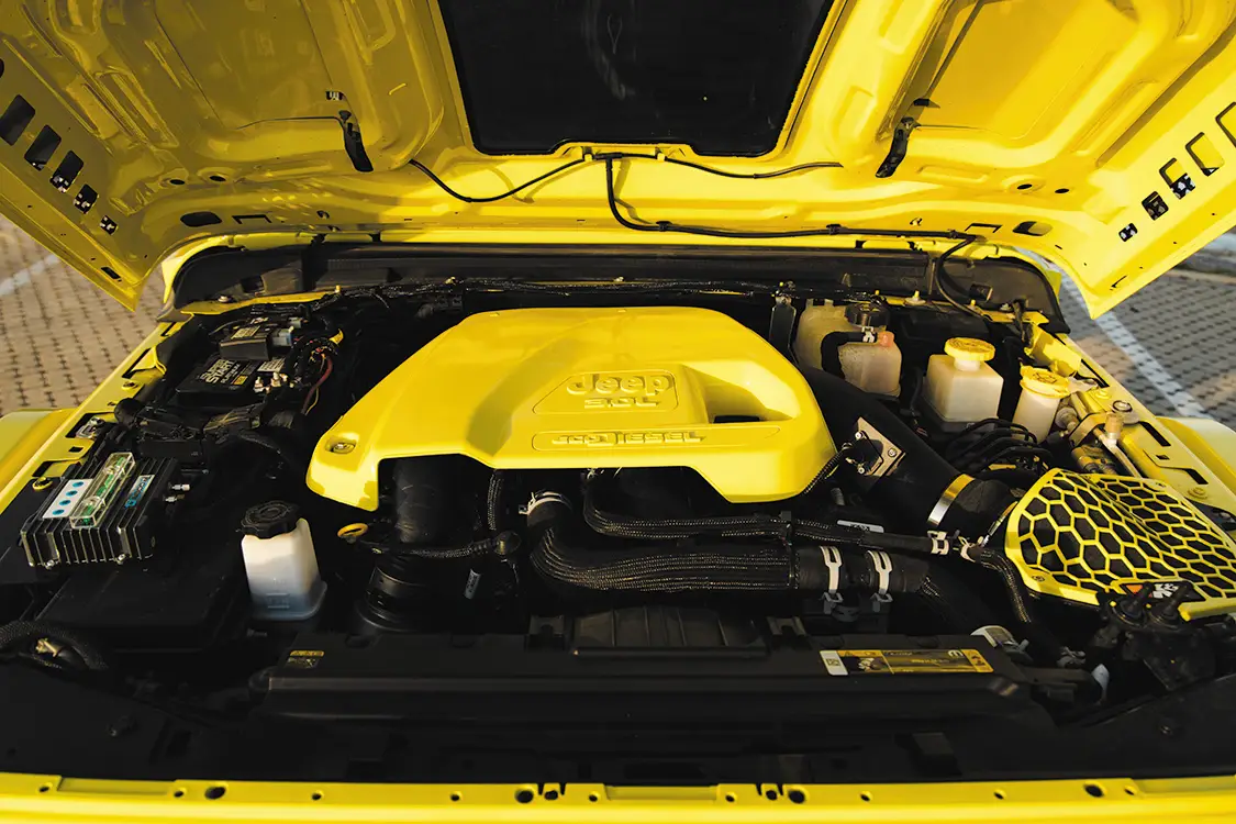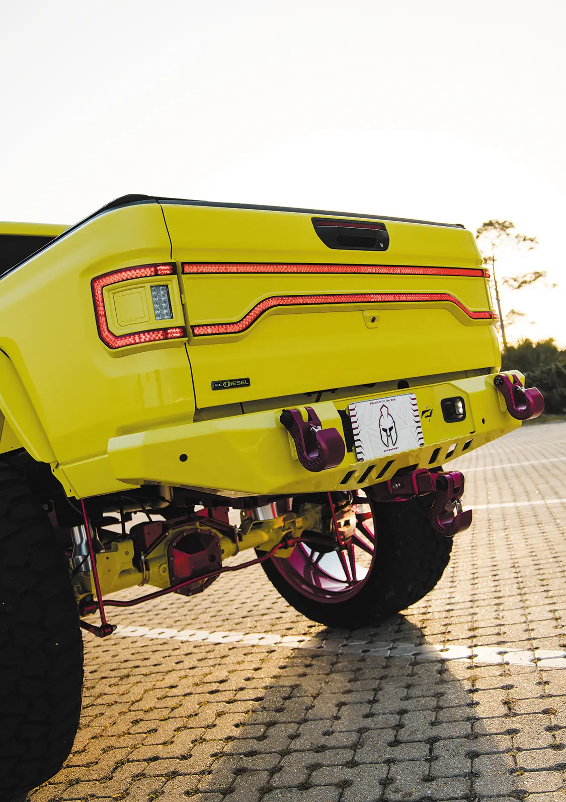 For such a big vehicle, it drives easily, rides nice, and shoots really well. Riding with Kyle to the shoot, the Jeep made all the right noises and sights we come to expect from your typical diesel build. The turbo spool, the dump of coal, the typical tractor grunts and groans, nothing is amiss with this Jeep. Somehow, we managed to be spared the pain of dealing with a million boat launches at the slip and had a stress-free shoot that netted us some awesome pics. The whole Jeep has been painted in High Velocity Yellow, with Prismatic Powder Illusion Pink on the accents, by Jeremy Forrest out of Slidell, LA. EOC Performance did a wonderful job color matching the engine bay to the custom paint all over, as well as installing a great sounding 3” exhaust. Did we mention the whole thing is on airbag suspension? Somehow Accu-Air made an air system that when aired out allows Kyle to stuff the 30×16 KG1 Forged Trickstars on 44 INCH tires all the way to the fenders and then gives him eight inches of lift from there when airing up. Supporting the air setup are some Triangulated Upper rear 4 link kit from Rock Krawler, as well as Elev8 control arms, all powdered of course.