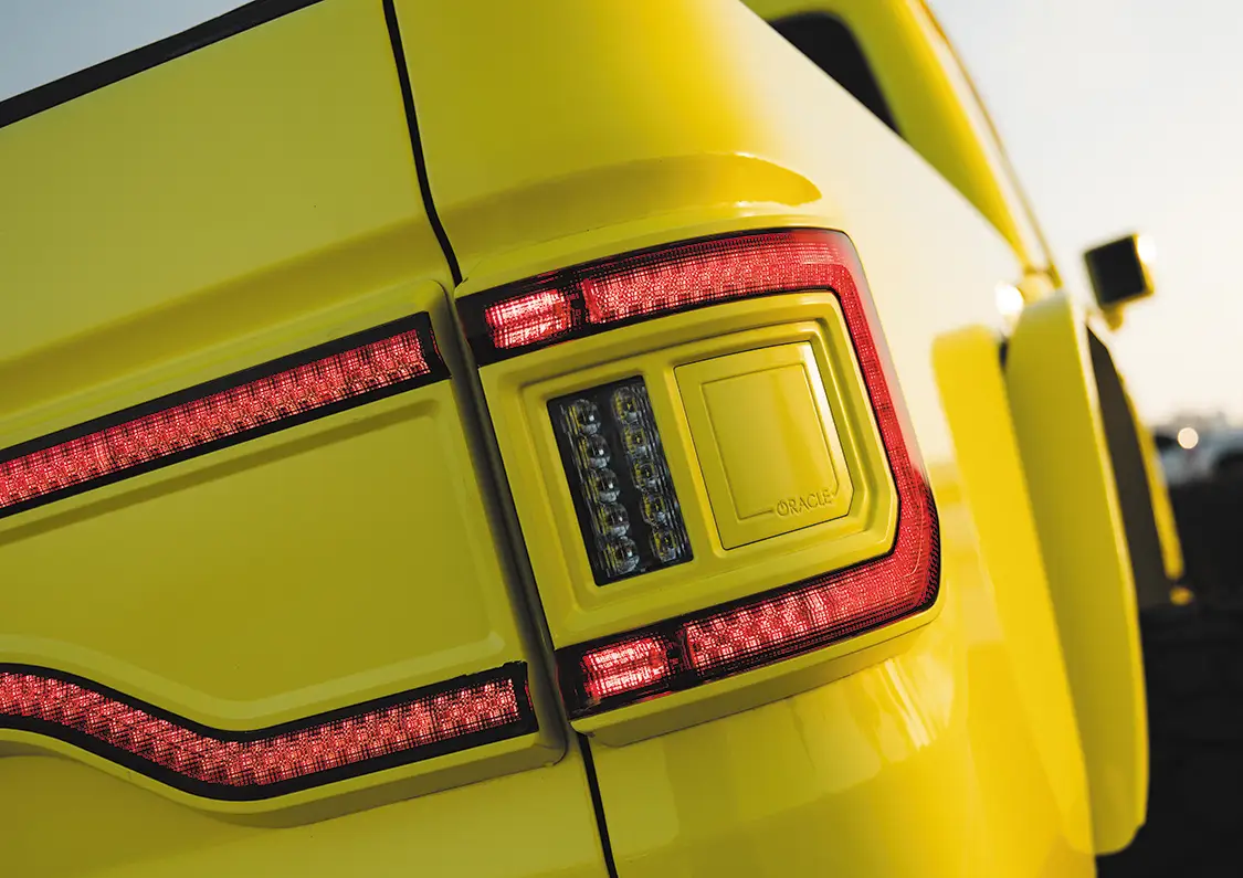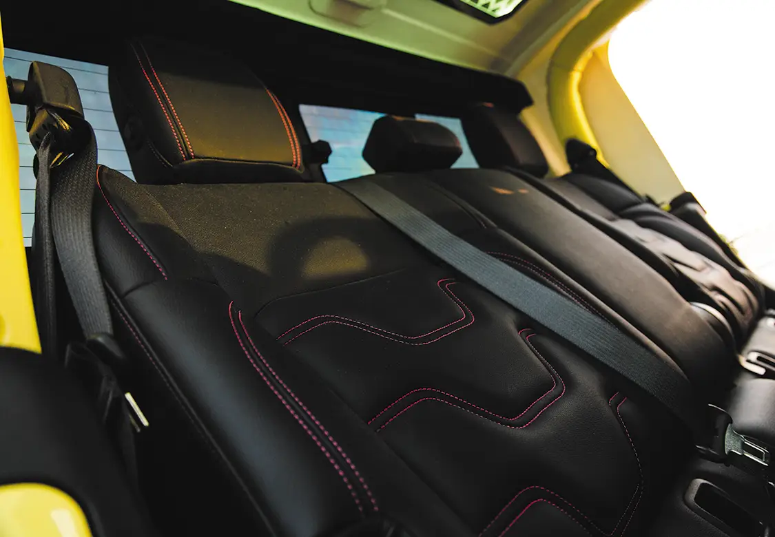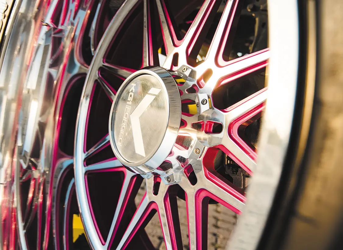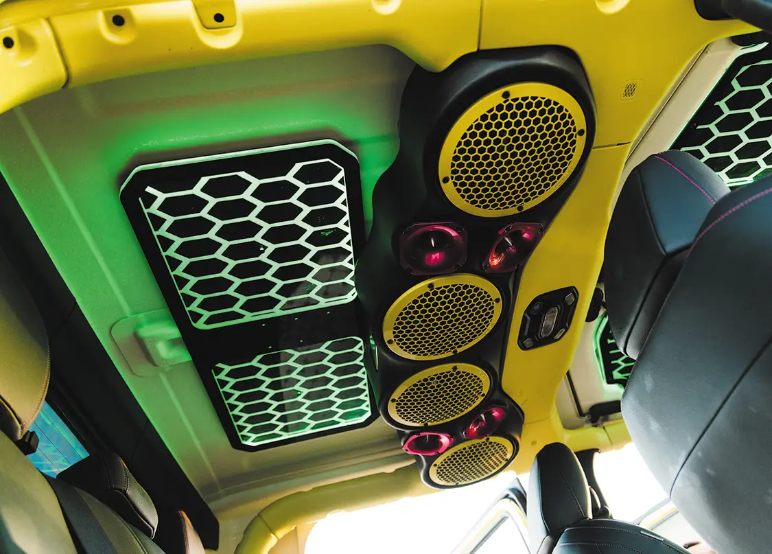 The inside is no different than the exterior, everything has been touched. A full DS18 sound system ensures you can blow out anyone’s ear drums, custom Alea Leather bucket seats with matching pink stitching upholstered by Amplified Designs are in every seat, US Speedo Amethyst edition gauges have been swapped in, and everything has been color matched to the High Velocity Yellow. Sitting in this and seeing the various accent lighting come together with the sound system and custom seats makes for a really enjoyable drive that doesn’t compromise on anything.