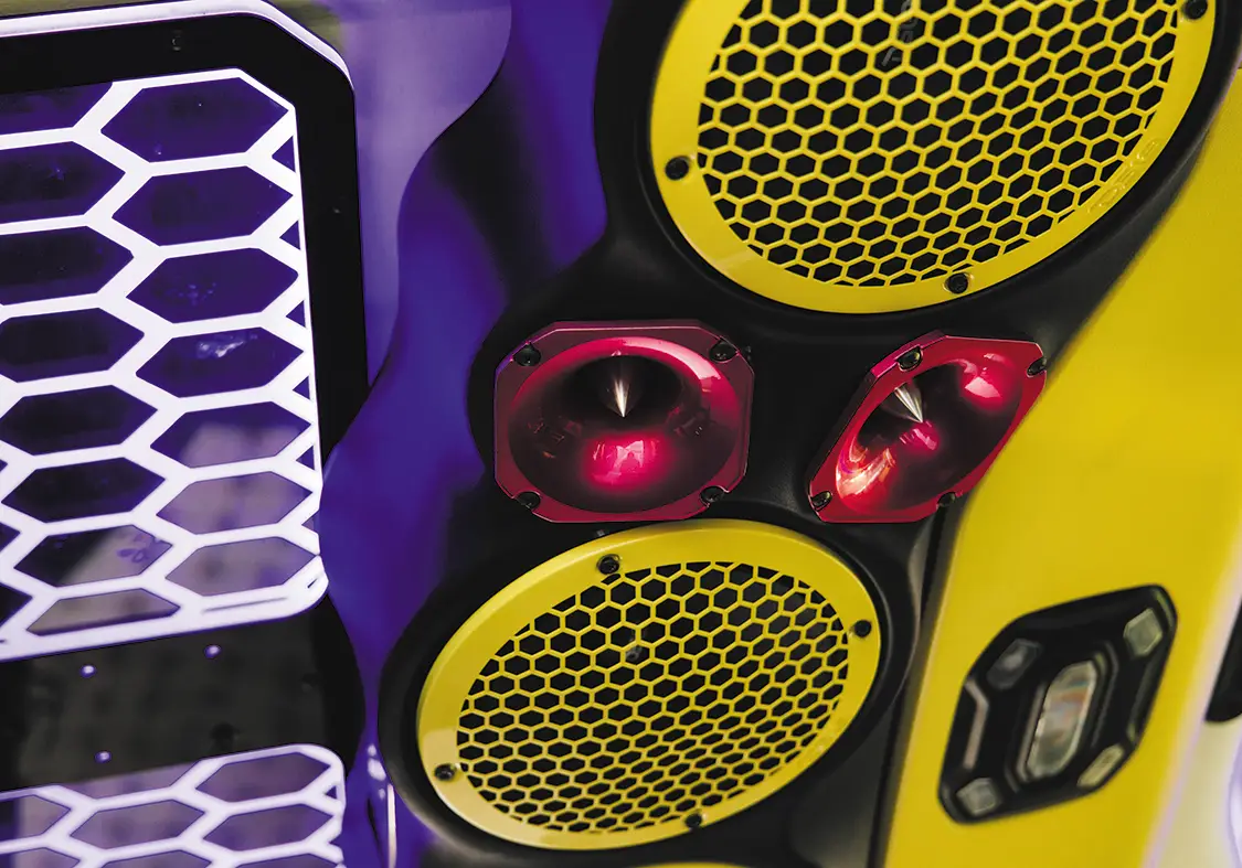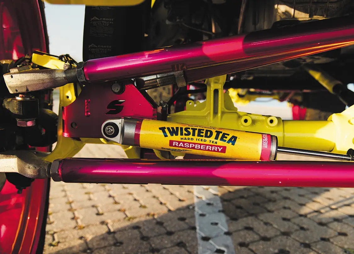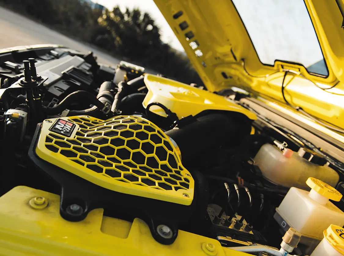 The inside is no different than the exterior, everything has been touched. A full DS18 sound system ensures you can blow out anyone’s ear drums, custom Alea Leather bucket seats with matching pink stitching upholstered by Amplified Designs are in every seat, US Speedo Amethyst edition gauges have been swapped in, and everything has been color matched to the High Velocity Yellow. Sitting in this and seeing the various accent lighting come together with the sound system and custom seats makes for a really enjoyable drive that doesn’t compromise on anything.