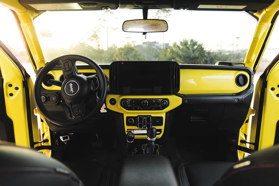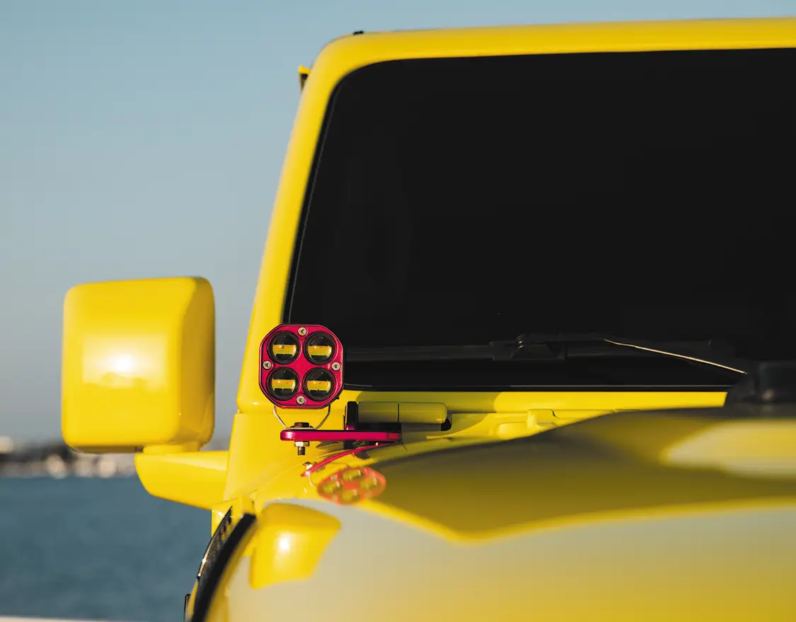 It looks insane, and it’s hard to show its size without having another vehicle next to it. It even made the boats going by look small! Now, Kyle isn’t the kind of Jeep guy to have five thousand ducks on the dashboard, but, in a funny twist of fate, he got ducked during our photoshoot; a lovely couple in from out of town in their own jeep loved Kyle’s and to our surprise, they just happened to have a pink party duck on hand! Watching Kyle squirm a little bit brought nothing but joy to our faces, and we had to document it for the article.
