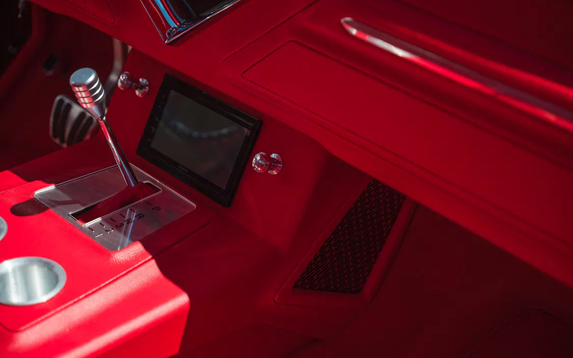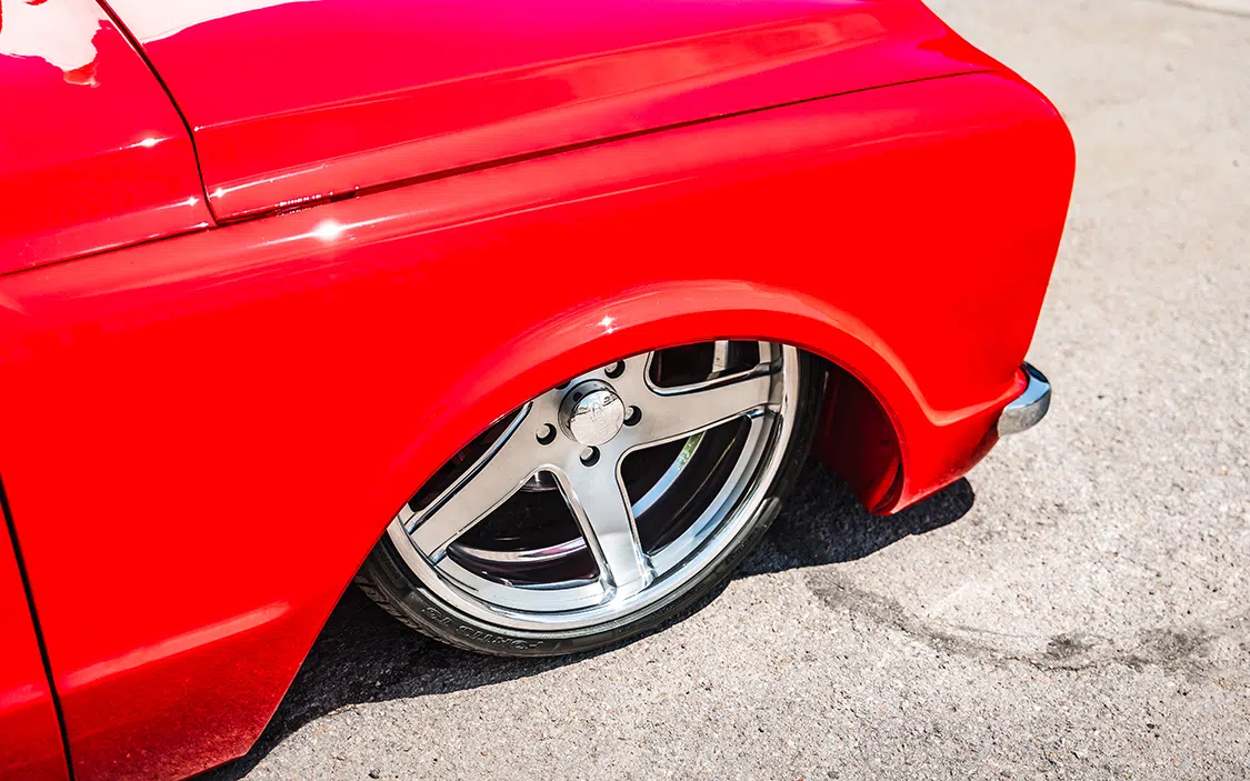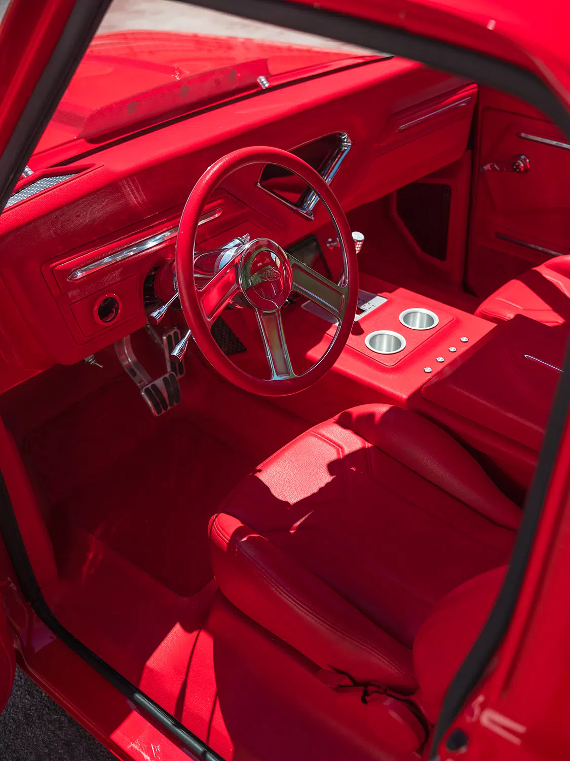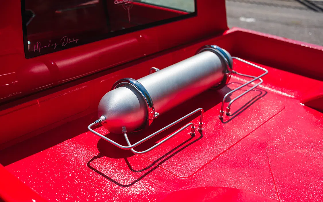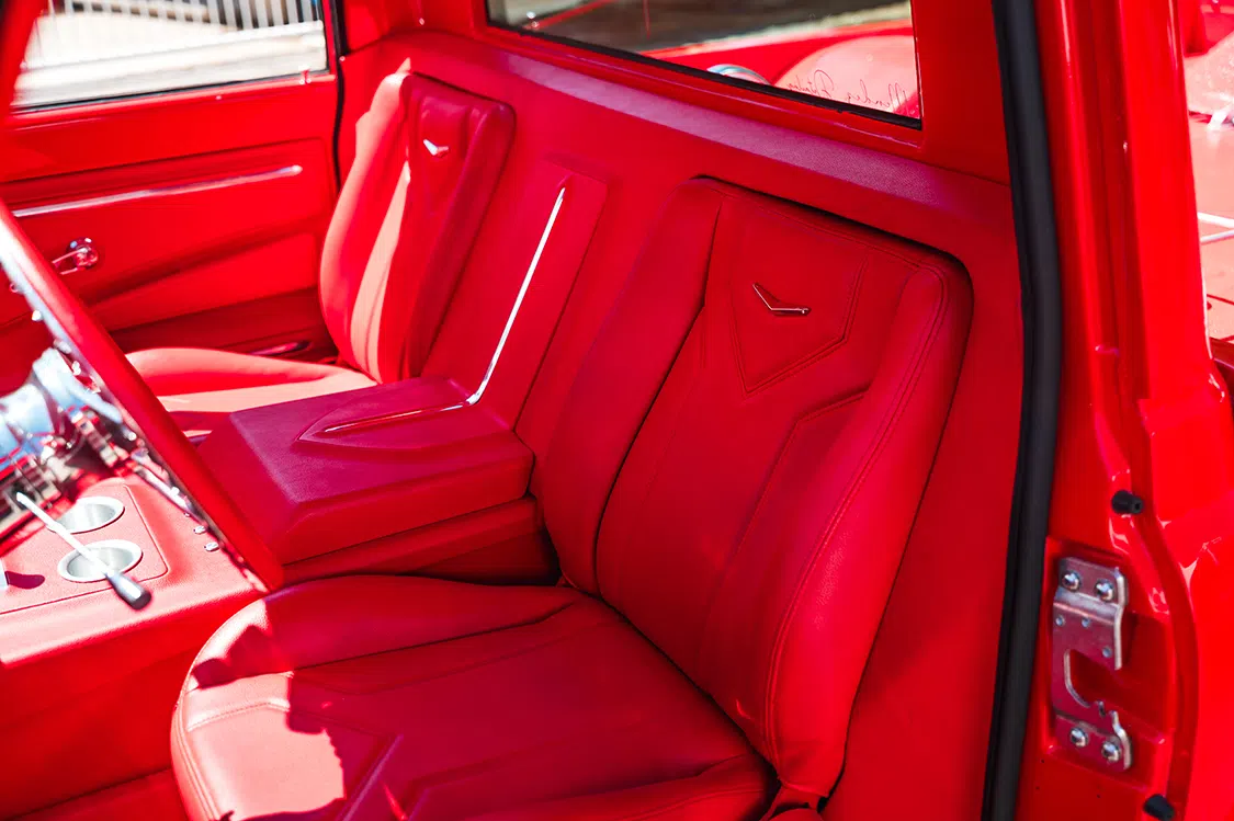 Inside, the truck’s interior is a striking blend of retro and modern. A dashboard from a ’58 Apache was integrated, becoming an instant conversation piece. The seats from a ’95 Cavalier were carefully color-matched to the truck’s bold red exterior, creating a cohesive look. In the rear, an ’02 Camaro rear axle was modified to accommodate 16-inch-wide Intro Apache wheels, with Camaro brakes to ensure it stops as beautifully as it goes. The air bag suspension on all four corners, combined with a raised bed setup, showcases the intricate wiring and craftsmanship that make this truck stand out from any angle.