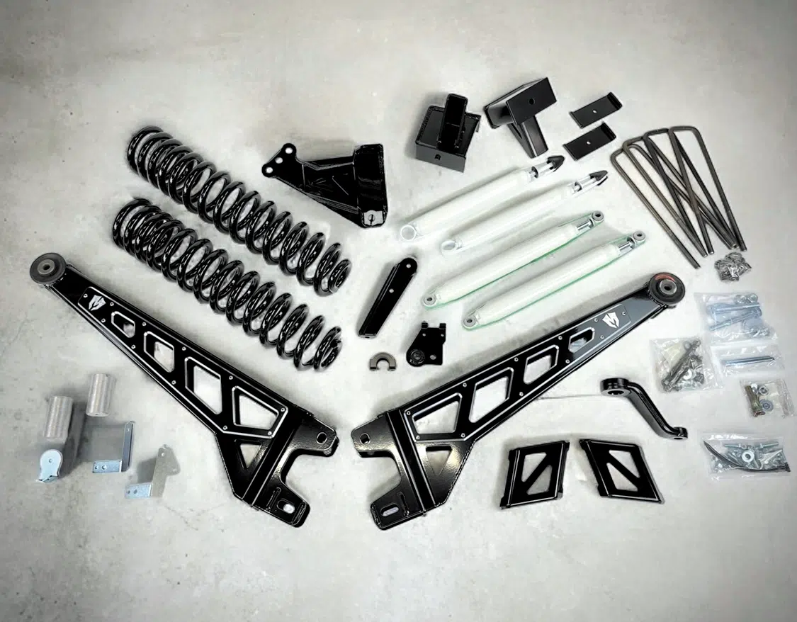 It can be a bit overwhelming shopping for a quality lift kit that checks all the boxes, and knowing how to navigate the different options and upgrades that complete a full system. This is the route we’ll take you through in this article. For our build we wanted a true Made in the USA quality company and lift so we chose the McGaughys premium S/S black 6-inch Ford lift kit (Part #57290, which we will detail here in sections). And we added a few upgrades that made sense for our application and use and paired with the perfect daily rolling stock of 37×12.5×18 Toyo Tires and Raceline wheels, which we will also detail here.