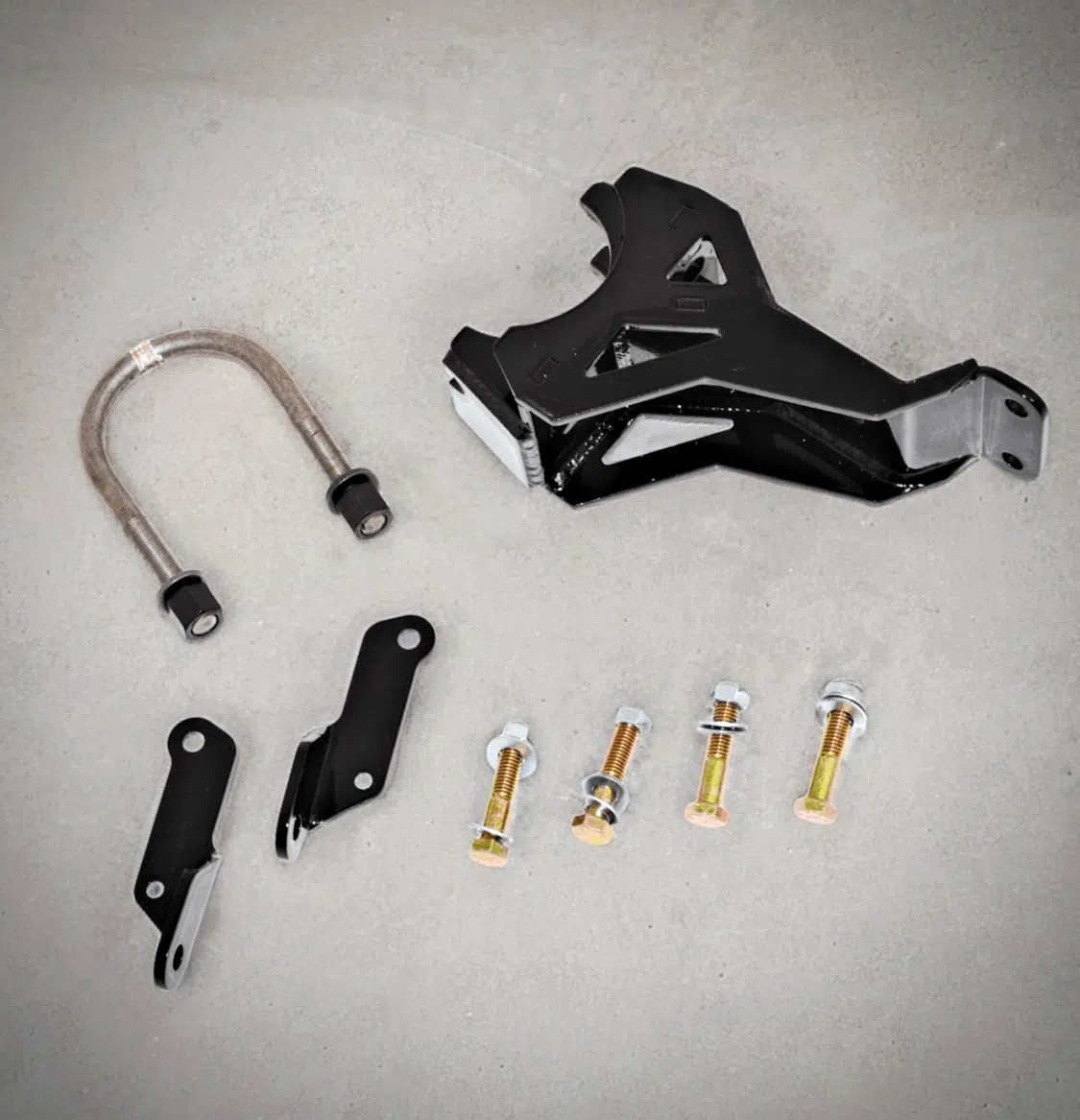 The rear kit consists of two lift-blocks with U-bolts, U-bolt retainers, and hardware, track bar drop brackets, rear brake line brackets, and rear shocks. The rear track bars are an upgrade option and come raw (Part #57295), but the billet track bar faceplates can come powdercoated black (Part #51321).