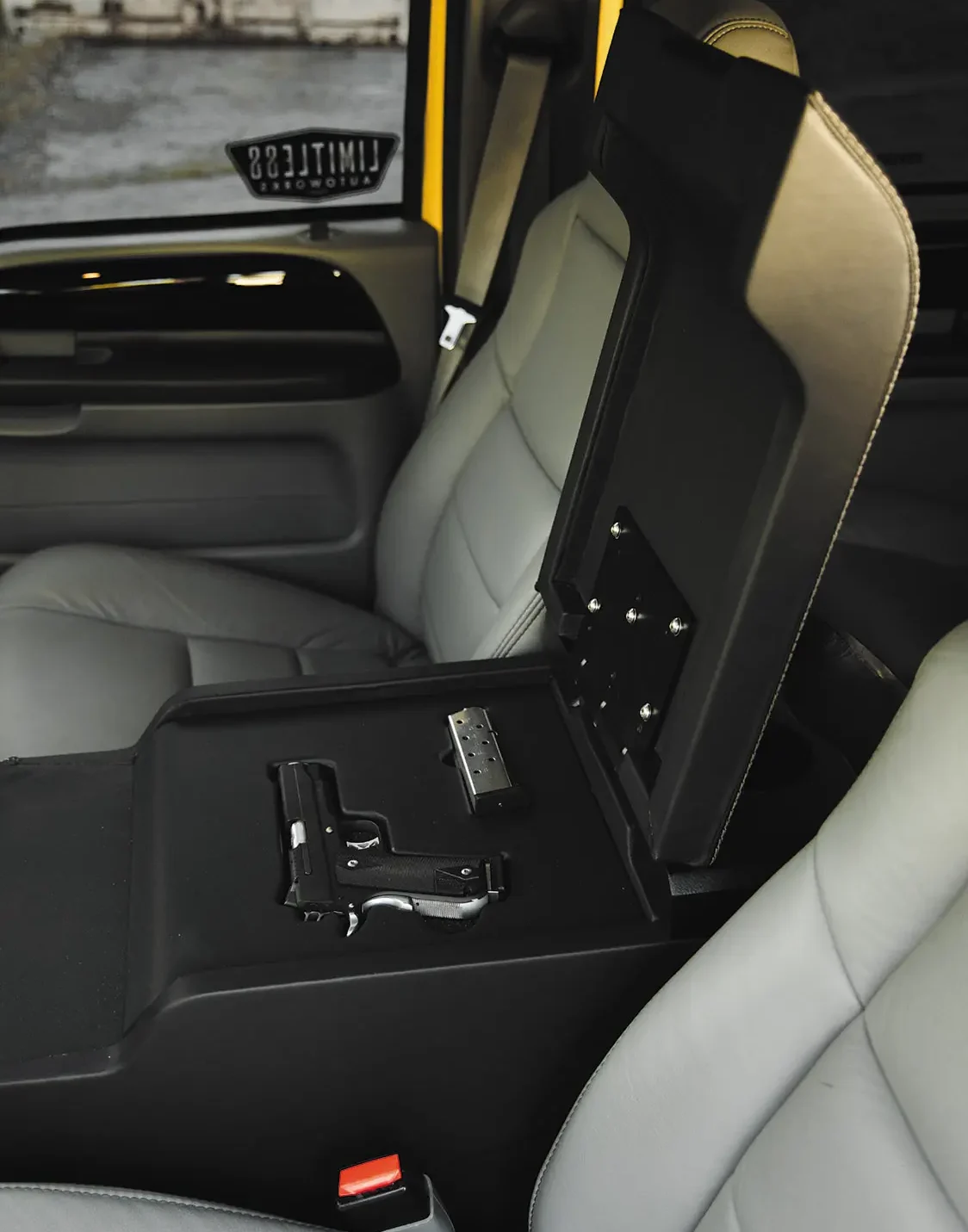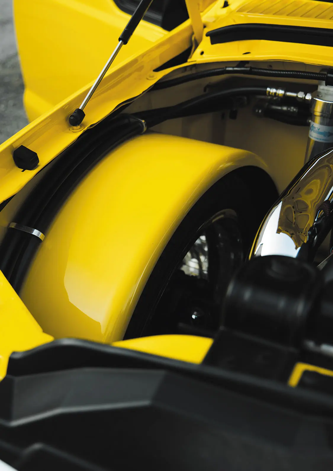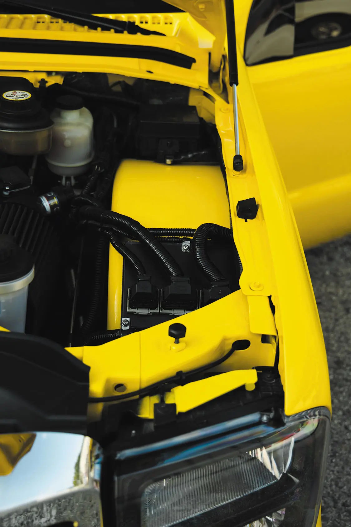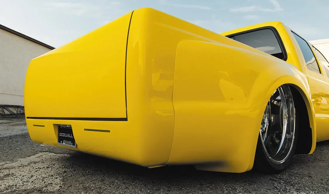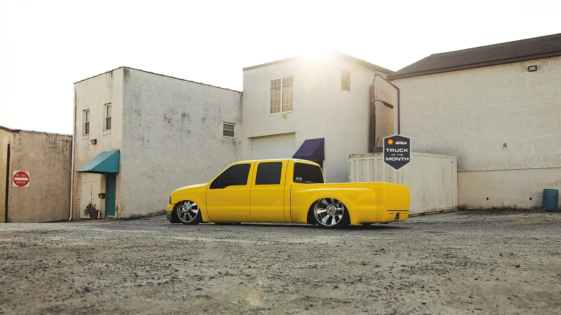 The build phase to follow would see a collaboration of Limitless Autoworks and Matus Brothers Auto Body in Bridgeport, PA. Together, the two shops teamed up to shave a great deal of items from the Ford’s exterior façade, including the door handles and both side mirrors and taillights, along with a clean up of the bed rails and fenders. To add that lasting bit of aggressive styling to the F-350, Rich allowed Matus Brothers the great pleasure of spraying the DuPont Mellow Yellow 3-stage paint job.