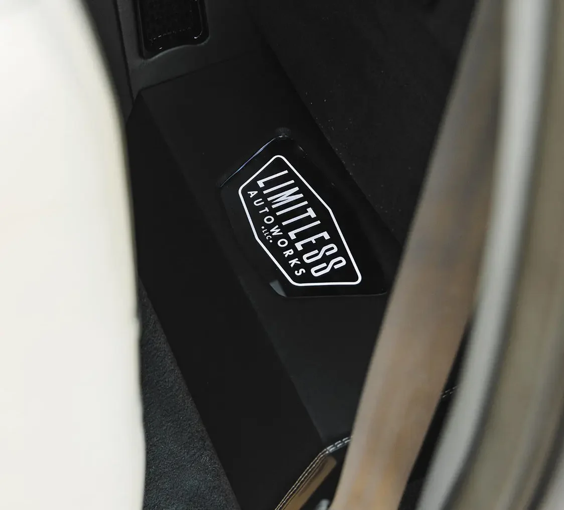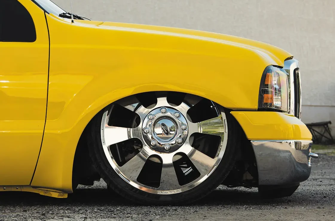 While most of Limitless Autoworks’ clientele opt to lift their heavy-duty pickups, Rich has always had an affinity for pavement pounding, low-rolling haulers. To slam the truck down much lower than factory height, Rich wired up a front and back air ride system to achieve full adjustability of its cruising altitude. A new set of control arms, and keeping the factory front knuckles, allows the front to air out fully, and a custom rear 3-link system with a wishbone setup gives the Ford the advantage of comfortable ride quality.