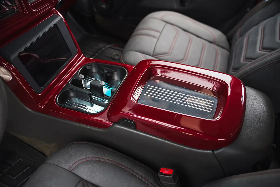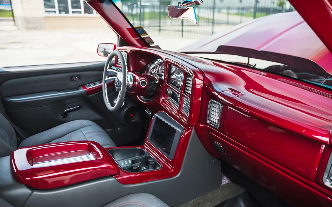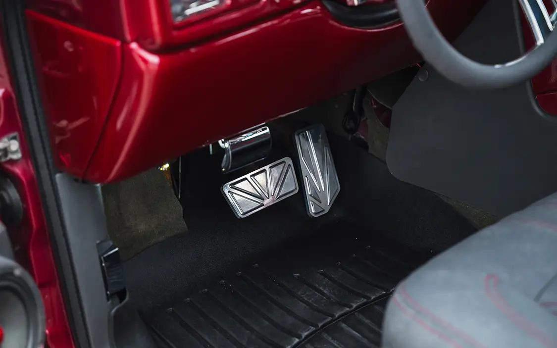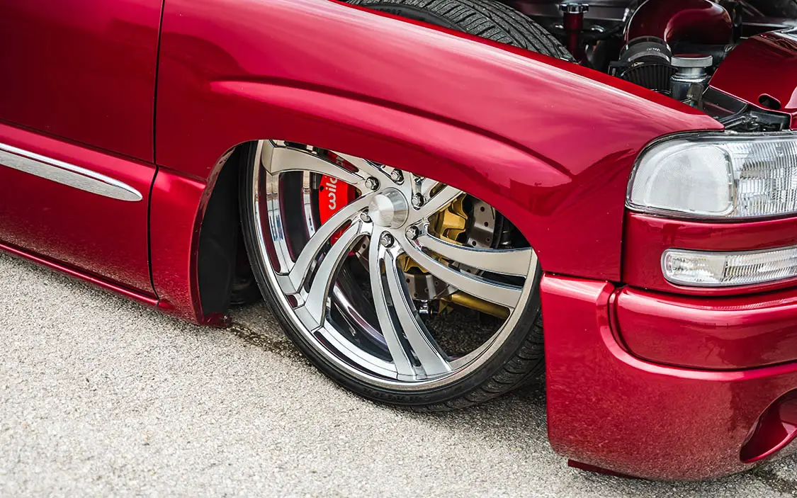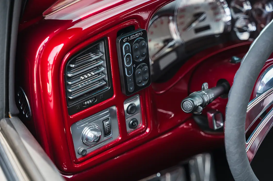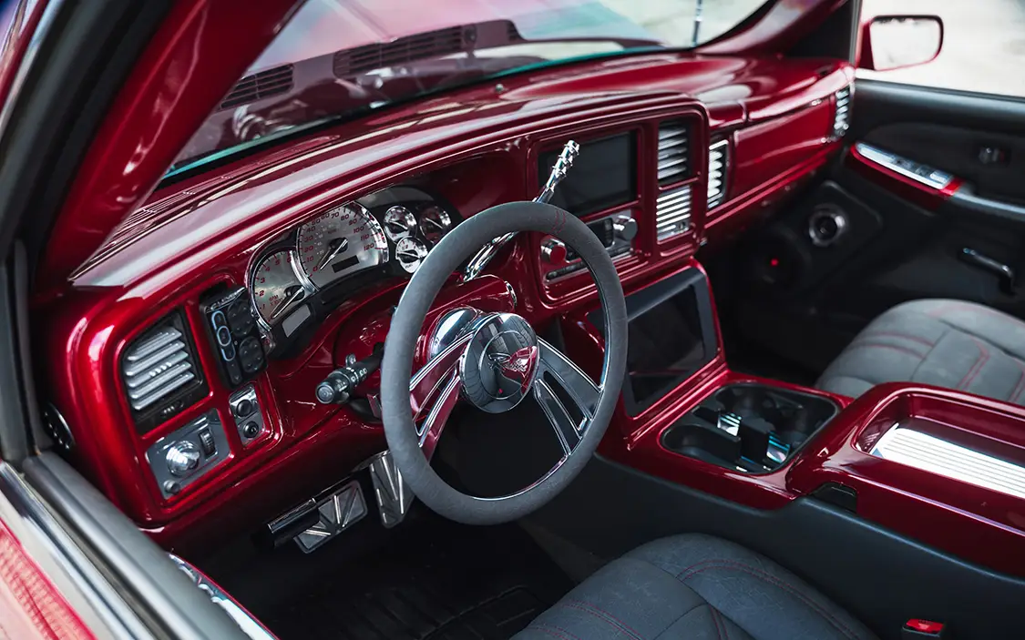 On the rollers, Low4Doe flexes big: 28×9 reverse-lip Raceline Charger wheels up front and 28x10s at the rear. Yeah, you read that right—28s! That’s serious truck culture style, showing off polished Raceline billets and color-matched panels with billet inserts all the way through. Inside the cab you’ll find reupholstered original seats wrapped in distressed, wrinkled gray material with red stitching, plus a color-matched dash dialed in by Angel’s Custom Interior.