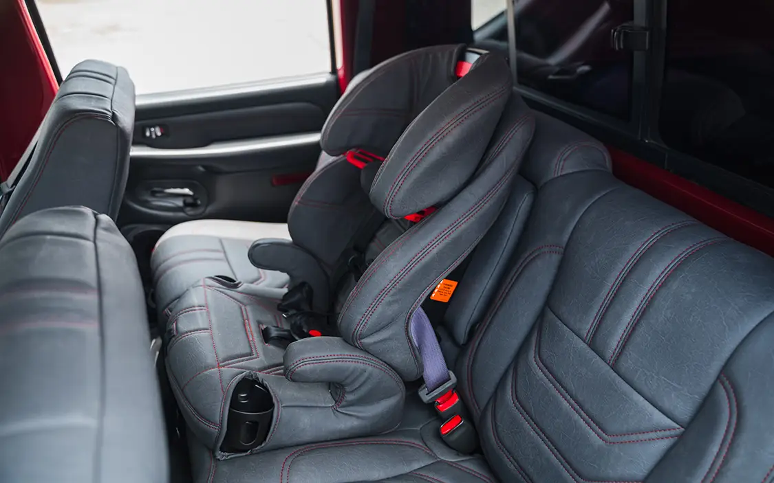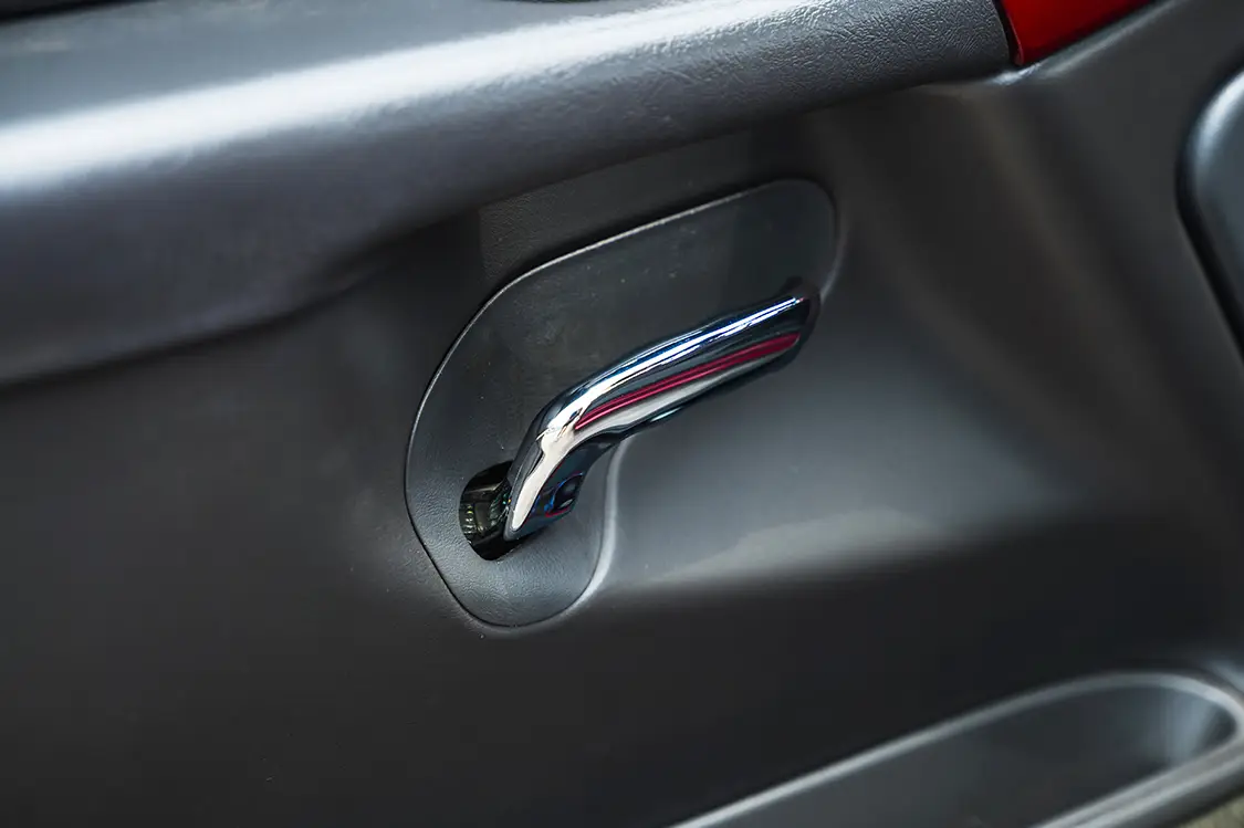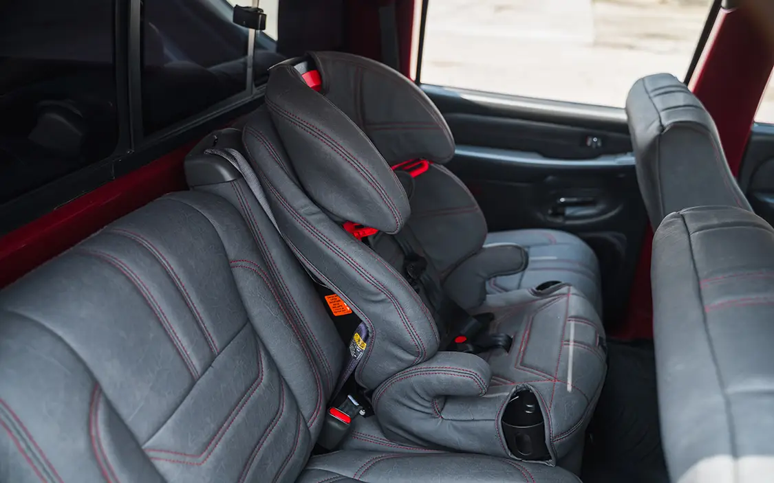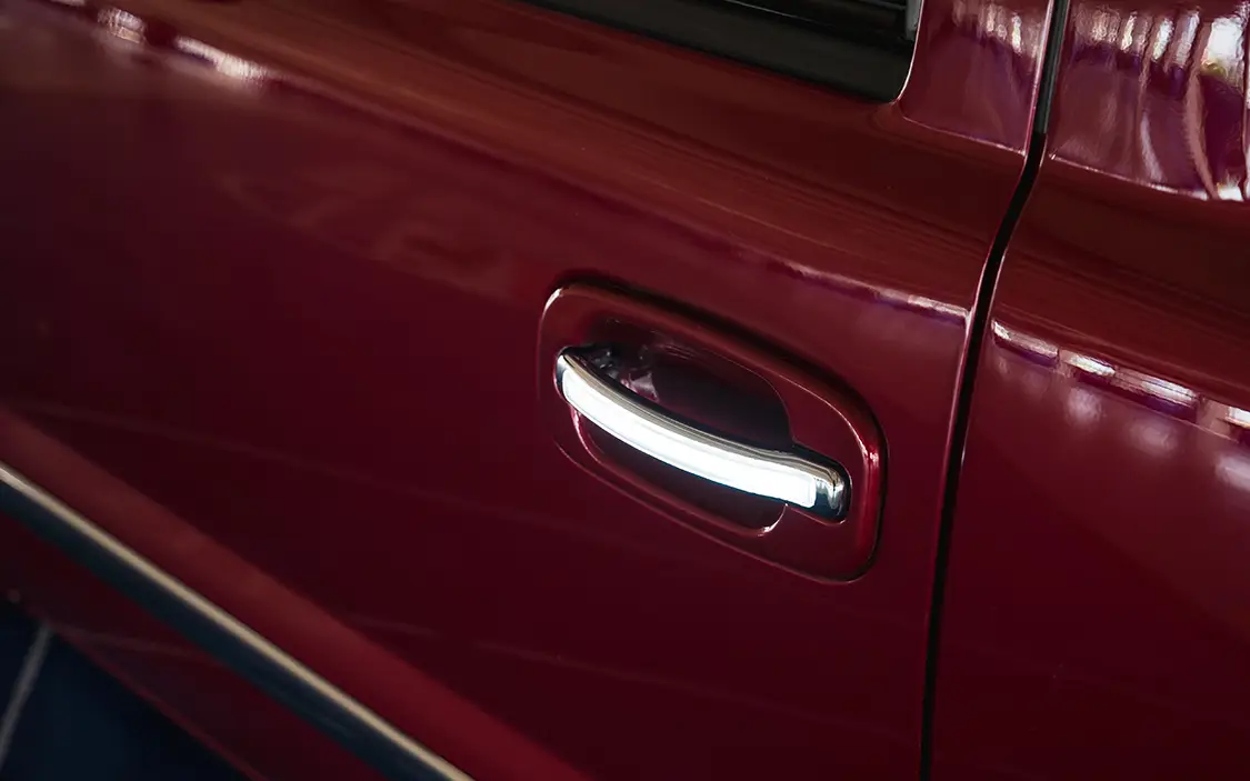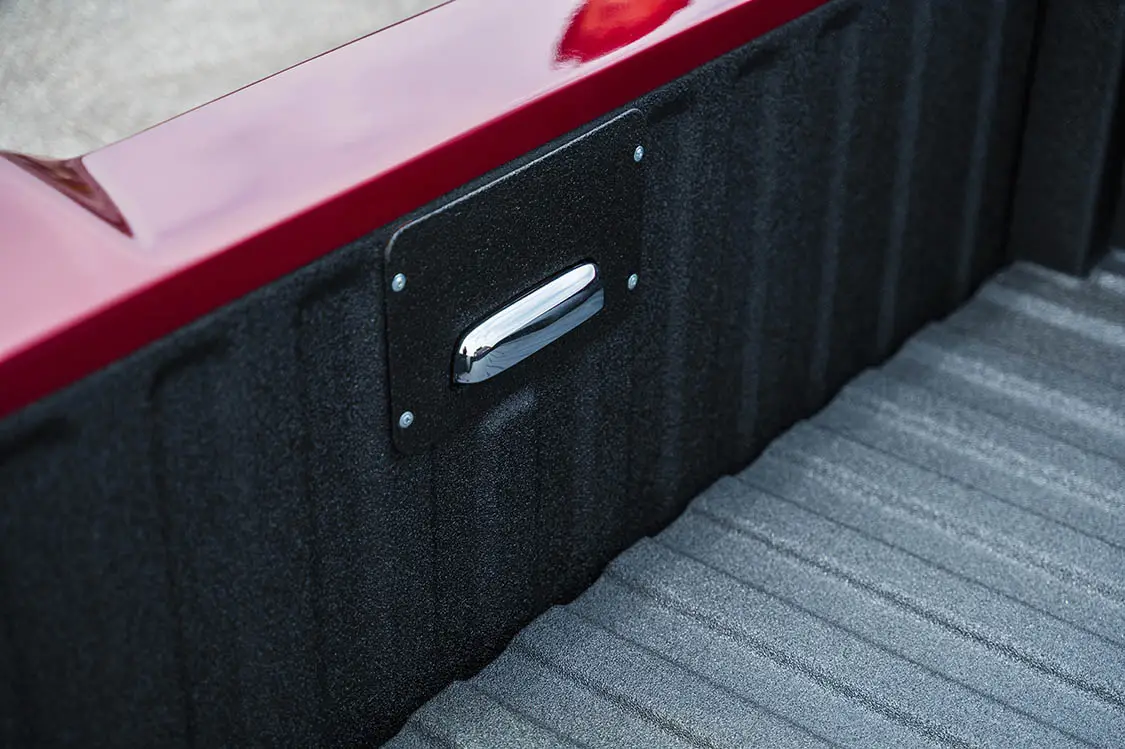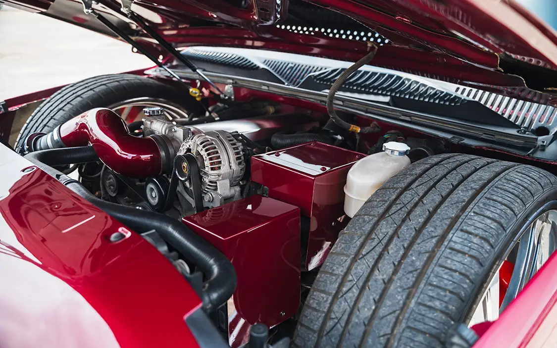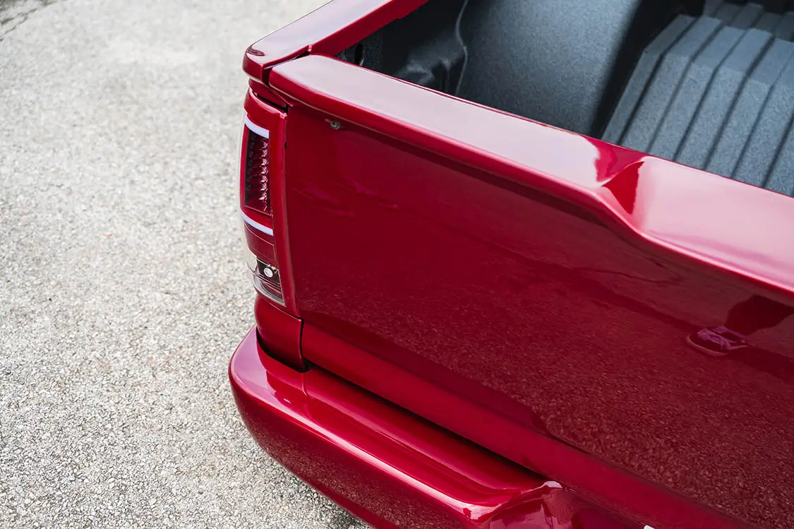 On the rollers, Low4Doe flexes big: 28×9 reverse-lip Raceline Charger wheels up front and 28x10s at the rear. Yeah, you read that right—28s! That’s serious truck culture style, showing off polished Raceline billets and color-matched panels with billet inserts all the way through. Inside the cab you’ll find reupholstered original seats wrapped in distressed, wrinkled gray material with red stitching, plus a color-matched dash dialed in by Angel’s Custom Interior.