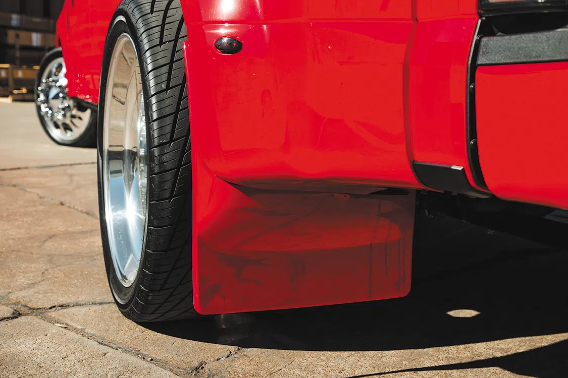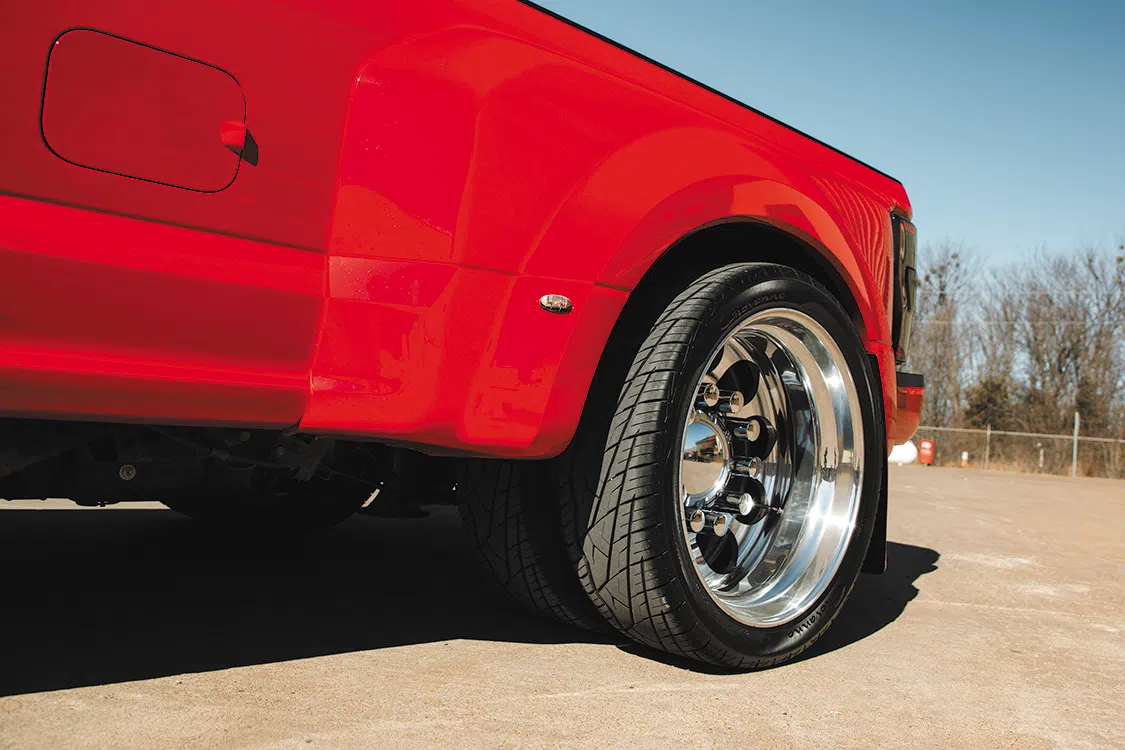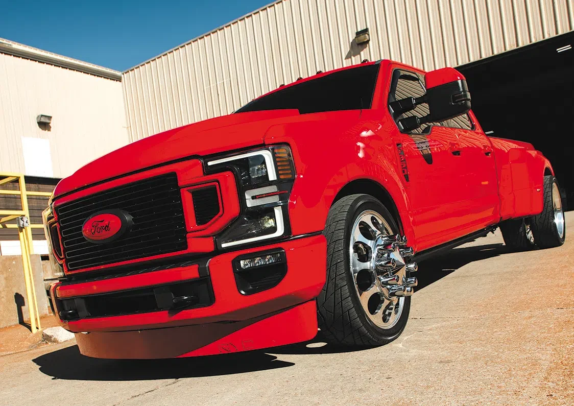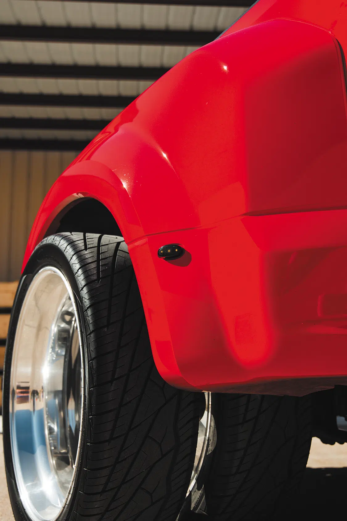 While Randall’s dually maintains its superior towing and hauling abilities, it’s the truck’s unique details that elevate it to a different class—or lower it—as the next thing you’ll notice about the truck second only to the red paint is its lower than average stance.