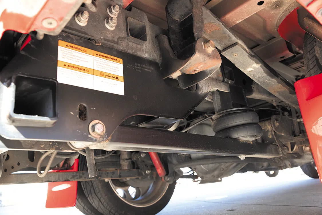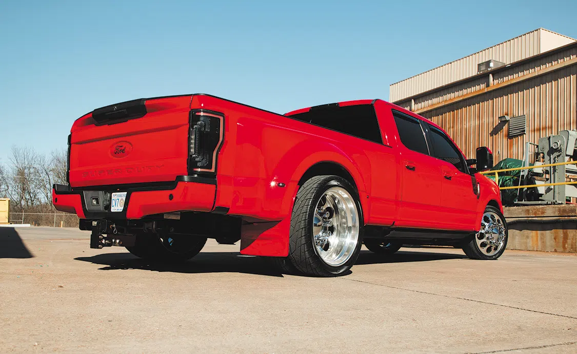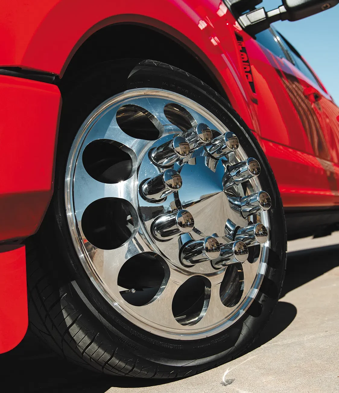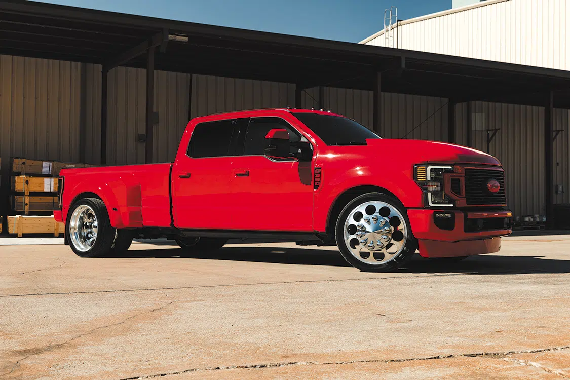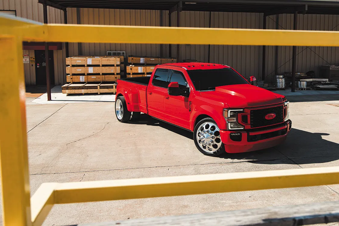 While Randall’s dually maintains its superior towing and hauling abilities, it’s the truck’s unique details that elevate it to a different class—or lower it—as the next thing you’ll notice about the truck second only to the red paint is its lower than average stance.
