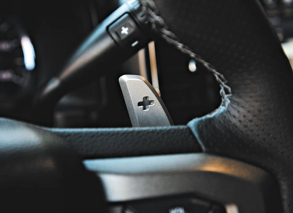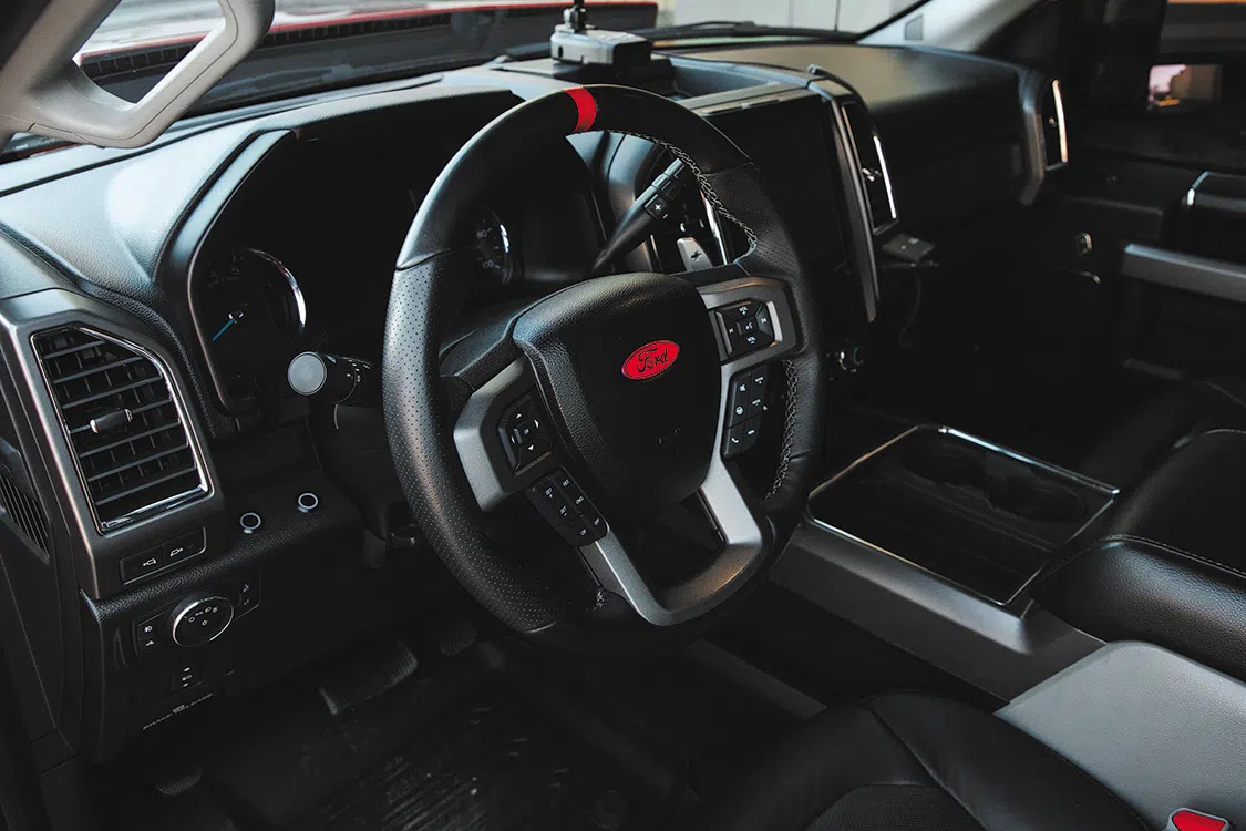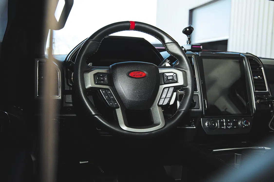 Inside, the truck fittingly maintains its factory black leather upholstery, but the steering wheel has been upgraded to that of a factory Ford Raptor along with paddle shifters. The stereo system saw the biggest upgrade inside, featuring a Phoenix stereo system with a 13-inch Tesla Style digital screen head unit. The system also features a MTI Acoustics custom box with a 13-inch JL Audio subwoofer and matching JL Audio amplifier.