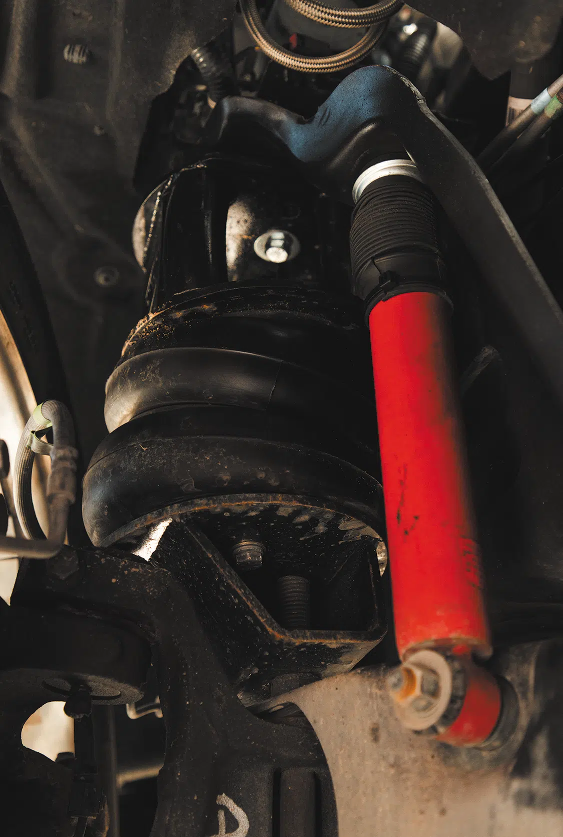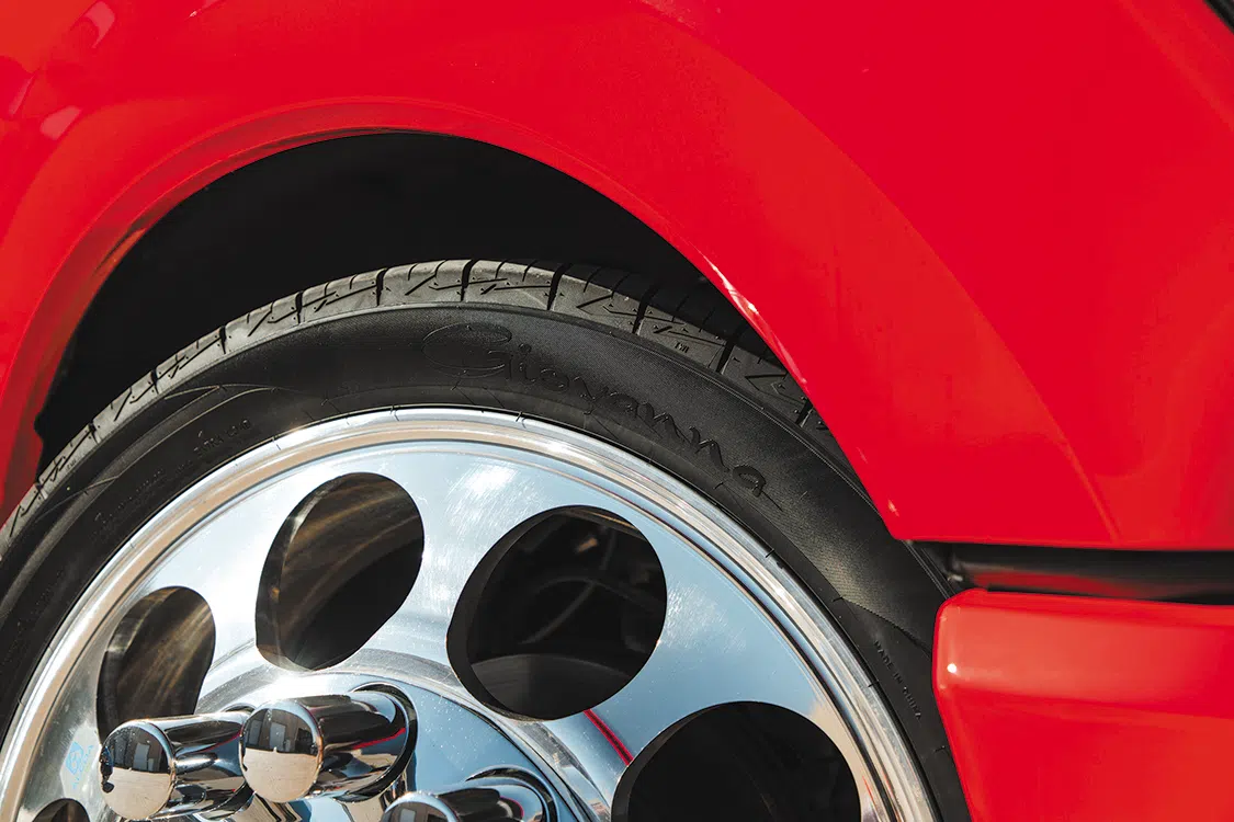 Adding to the truck’s unique look are stout 24-inch Alcoa wheels, which Randall wrapped in 285/40R24 Giovanna rubber – tires known for their all-weather performance as well as reduced road noise. Expertly tucked up into the truck’s fender wells, Randall tells us there is no rubbing from the tires to speak of, from one end of the truck’s steering to the other. The aggressive bulldog-like stance achieved by combining a bagged suspension with the large wheels and tires tucked up under the truck was certainly worth the effort to do it right.