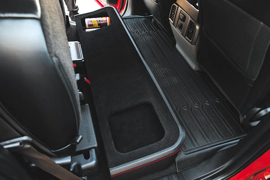 Outside, the truck features a Fomoco grille, RYD Motorsports bumper valance, and an aftermarket hood, all of which add to the overall character of the build. Nothing, however is quite as stunning as the Race Red paint that graces the body, laid by Donny Maner. Absolutely flawless, the color was chosen to garner attention, undoubtedly, but for us, its the meticulously chosen black accents and contrasting body-color badging that really makes the truck stand out. This is definitely not your average factory Race Red and black paint scheme!