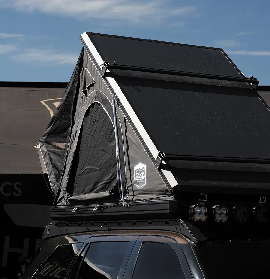 TRD Pro grille; AlphaRex NOVA-Series LED projector headlights; 10 KC HiLiTES secondary lights; CBI Offroad Covert bumpers; Westcott Designs roof rack; Cascadia Vehicle Tents Mt. Hood aluminum hard shell rooftop tent; Cascadia Vehicle Tents 270-degree awning; Factory Smoked Mesquite paint
