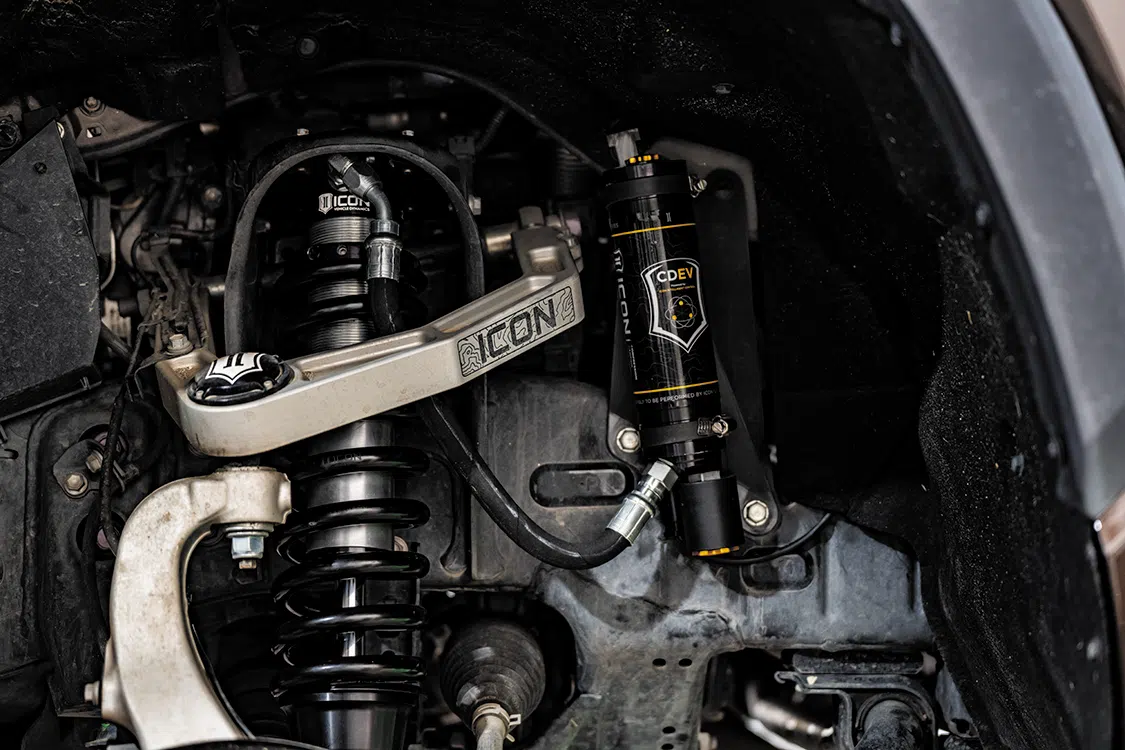 4-inch ICON Vehicle Dynamics suspension lift; ICON Vehicle Dynamics Stage 8 suspension system; ICON Vehicle Dynamics 2.5 Series remote reservoir with Compression Damping Electronic Valve (CDEV) coilover shocks both front and rear; ICON Vehicle Dynamic springs front and rear; ICON Vehicle Dynamics billet upper front control arms; ICON Vehicle Dynamics billet rear lower links; Suspension components installed by ICON Vehicle Dynamics and Off Road Warehouse